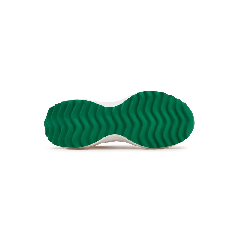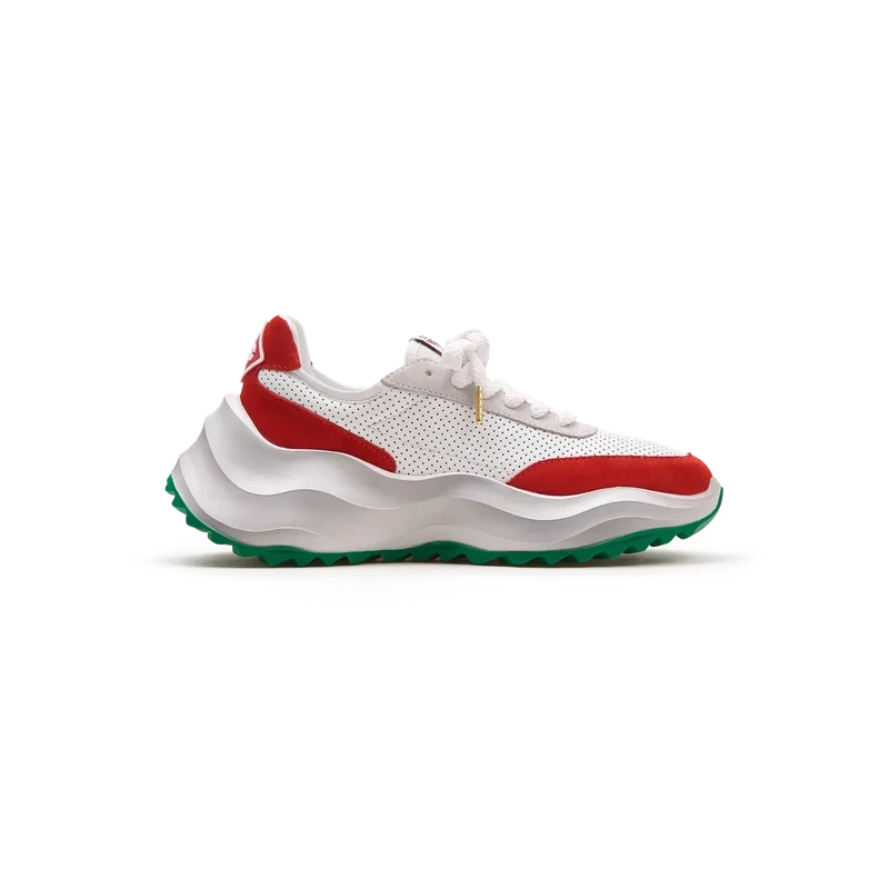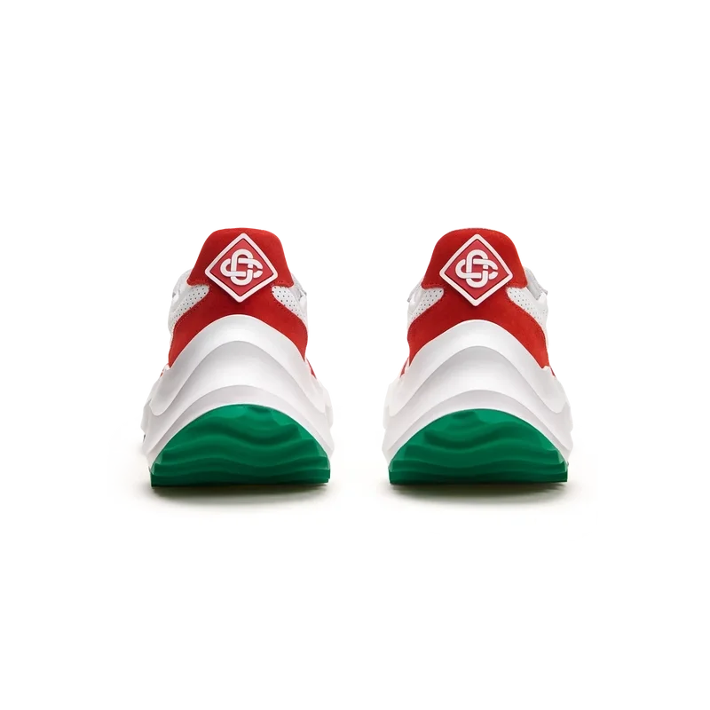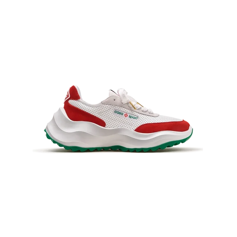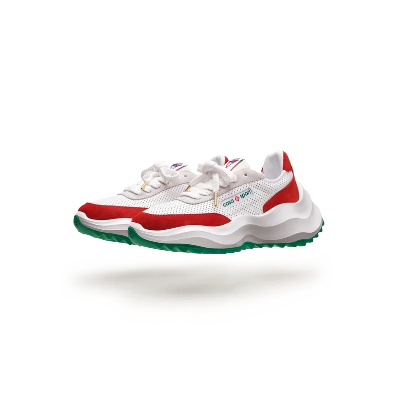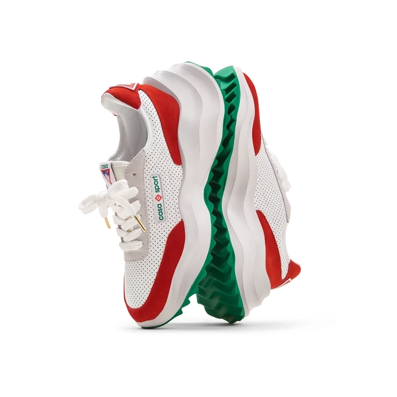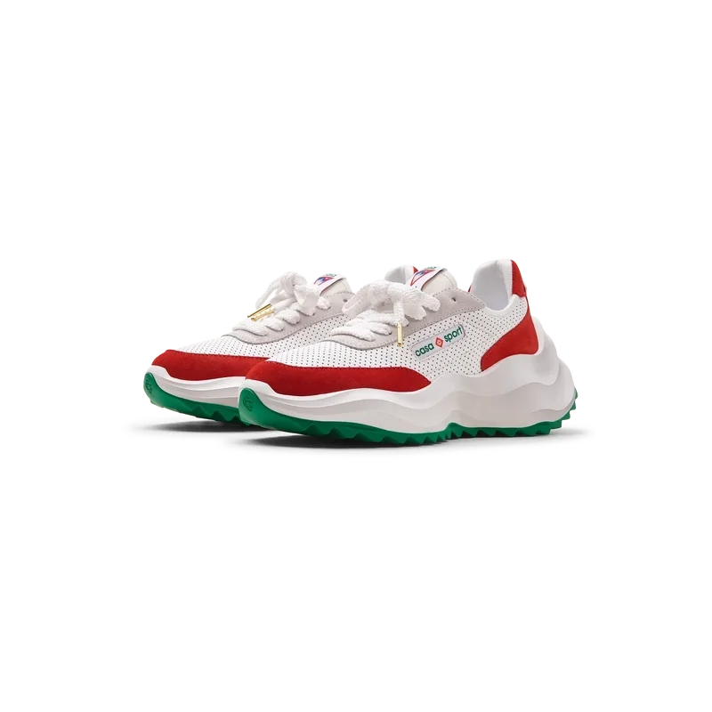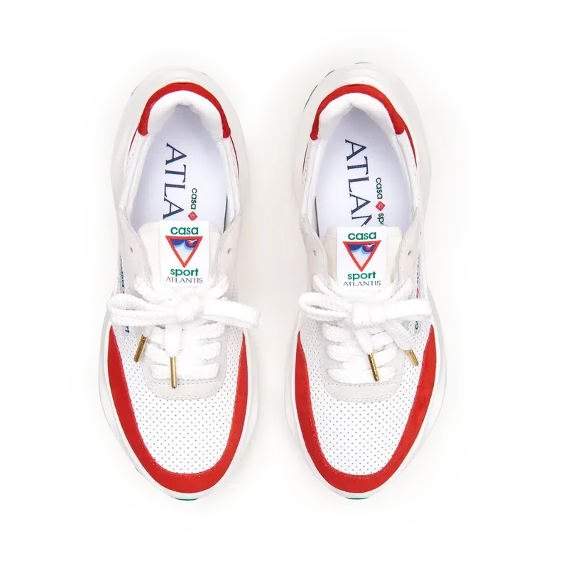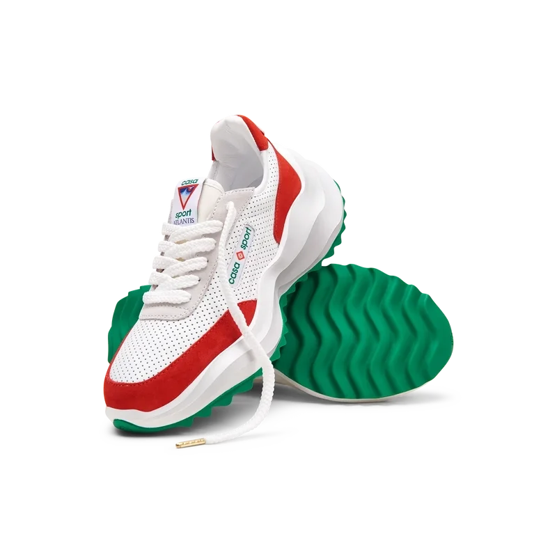 Sobreposições em camurça vermelha tonal, parte superior em couro perfurado, atacadores em camurça contrastante, patch de borracha com o diamante da Casablanca na aba do calcanhar, aba lateral com a marca Casa Sport tecida, etiqueta Atlantis tecida na língua, entressola em EVA esculpida com efeito ondulado, sola exterior em borracha, pontas dos atacadores douradas
