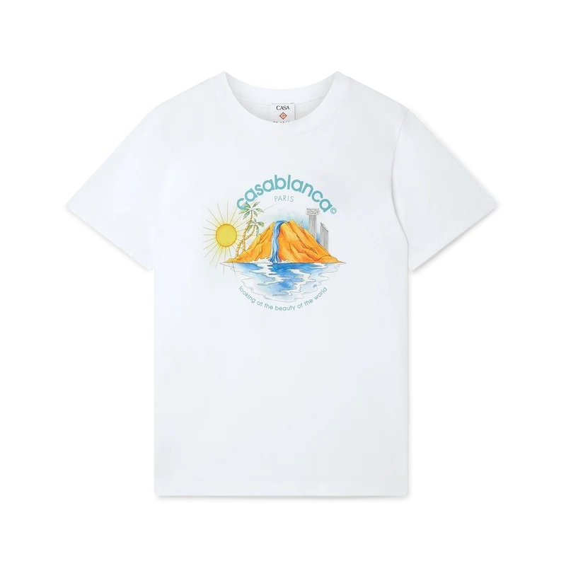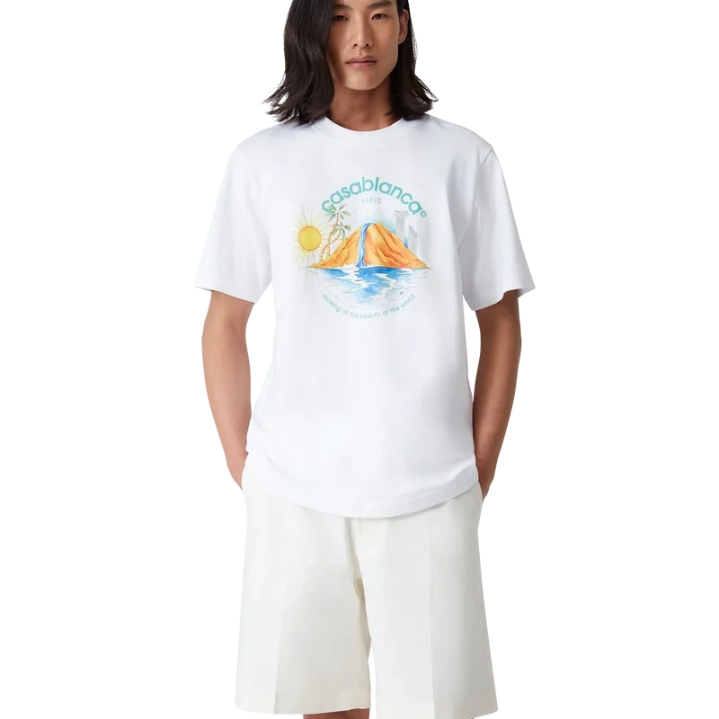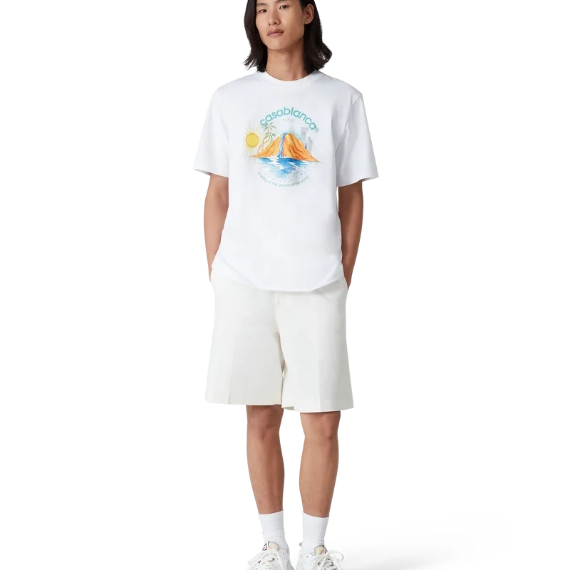 A T-shirt Oasis é um modelo de manga curta com estampado, confeccionado em tecido de algodão orgânico, apresentando a arte sazonal da marca com elementos de design da natureza, arquitetura e ténis. Com um clássico decote redondo.