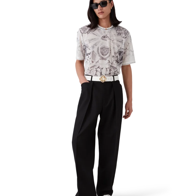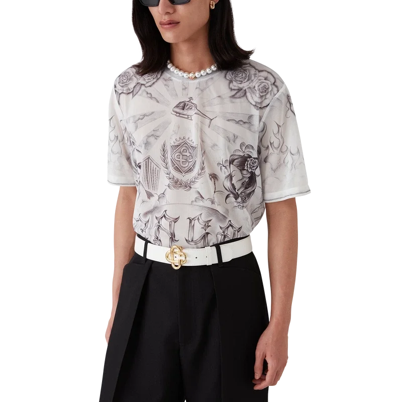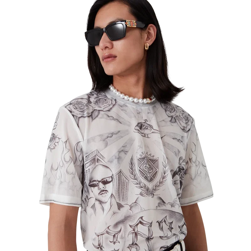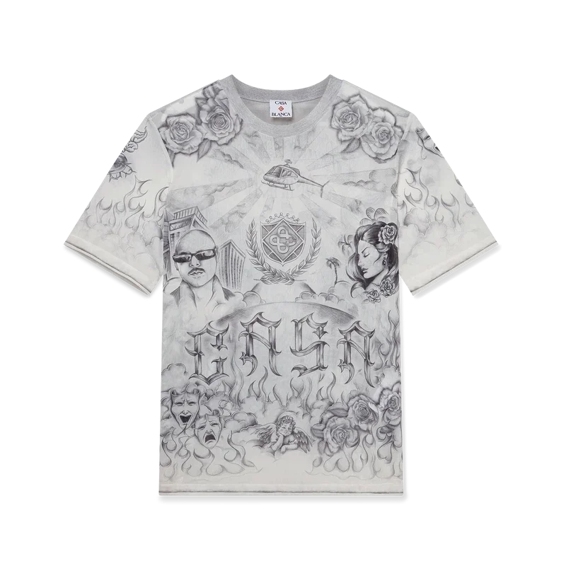 A Camisola de Malha Tattoo é um modelo de manga curta confeccionado num tecido de malha estampado com a arte da estação, inspirada na cena do bairro La, fazendo referência à rica cultura da tatuagem e às tintas cinzentas e pretas utilizadas nessas tatuagens. Com um clássico decote redondo.
