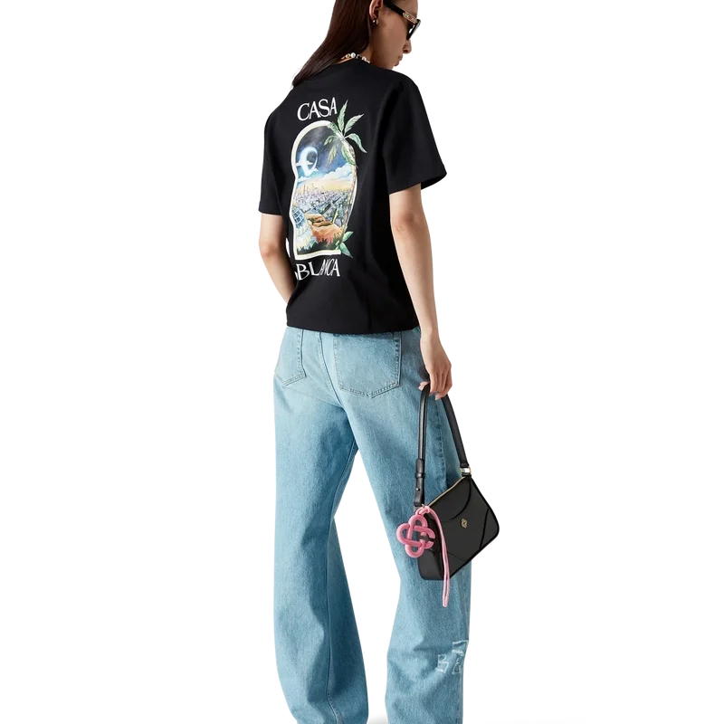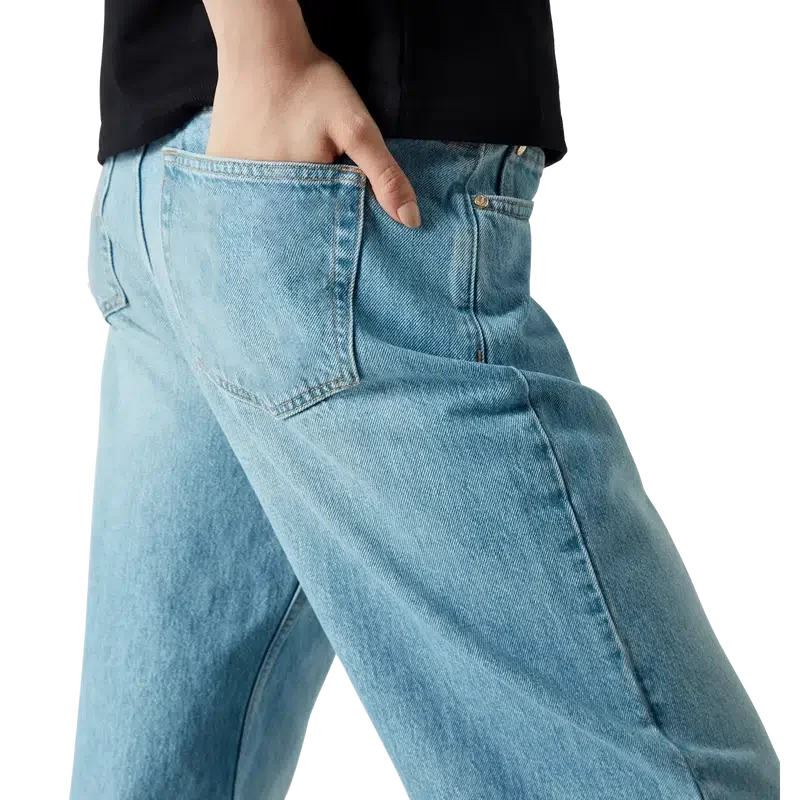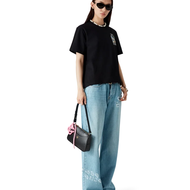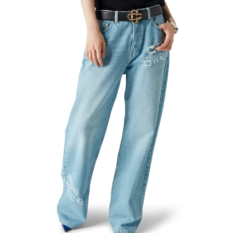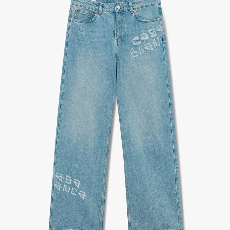 As calças de ganga com efeito desgastado e grafite têm um corte reto, são confeccionadas em tecido de algodão e apresentam o logótipo empilhado característico, gravado no tecido com um texto em estilo grafite. Completam-se com ferragens banhadas a ouro, presilhas para cinto, bolsos frontais e traseiros, um remendo de couro com a marca e fecho de correr.