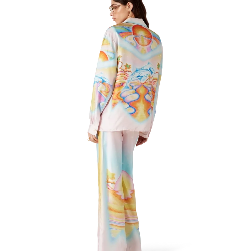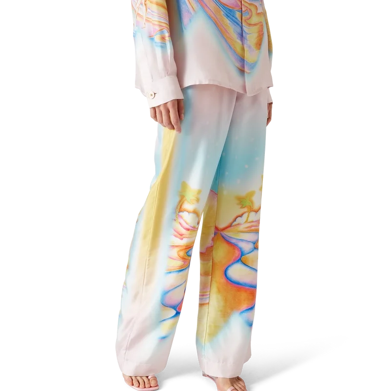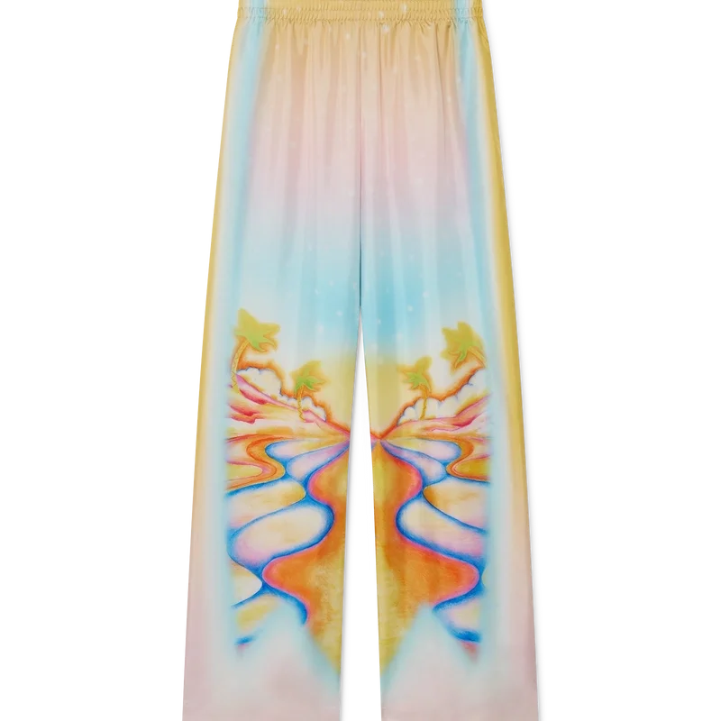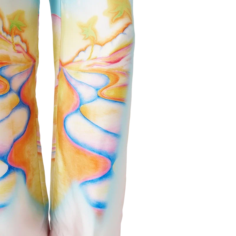 As calças de seda psicadélicas Nirvana apresentam um padrão estampado em toda a peça, confeccionadas em tecido de sarja de seda com um desenho inspirado nas pranchas de surf aerografadas da Califórnia dos anos 70, utilizando cores pastel que conferem à estampa uma sensação quase onírica e idealista. Acabamento com cintura elástica, fecho com cordão, bolsos laterais nas costuras e um bolso de remendo nas costas.