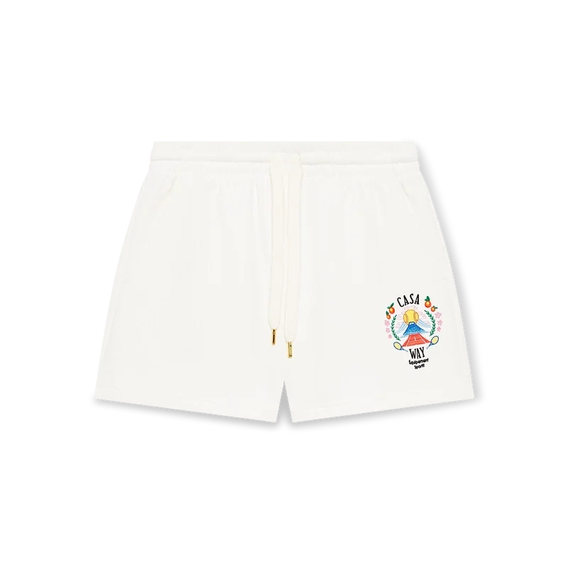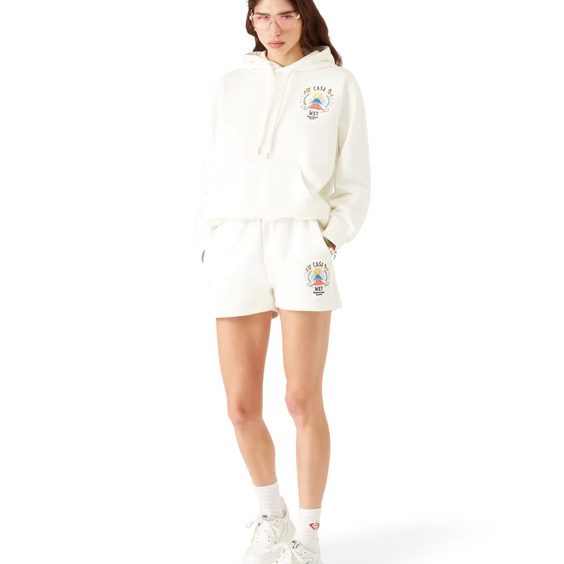 Os calções de treino Casa Way Mountain são uma peça de roupa desportiva confecionada em tecido de algodão orgânico, apresentando a arte sazonal da marca reinterpretada para esta estação. Completam-se com uma cintura elástica com cordão de aperto com pontas douradas, bolsos nas costuras e um bolso de remendo nas costas.