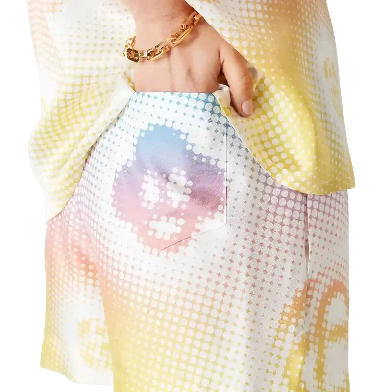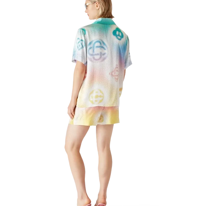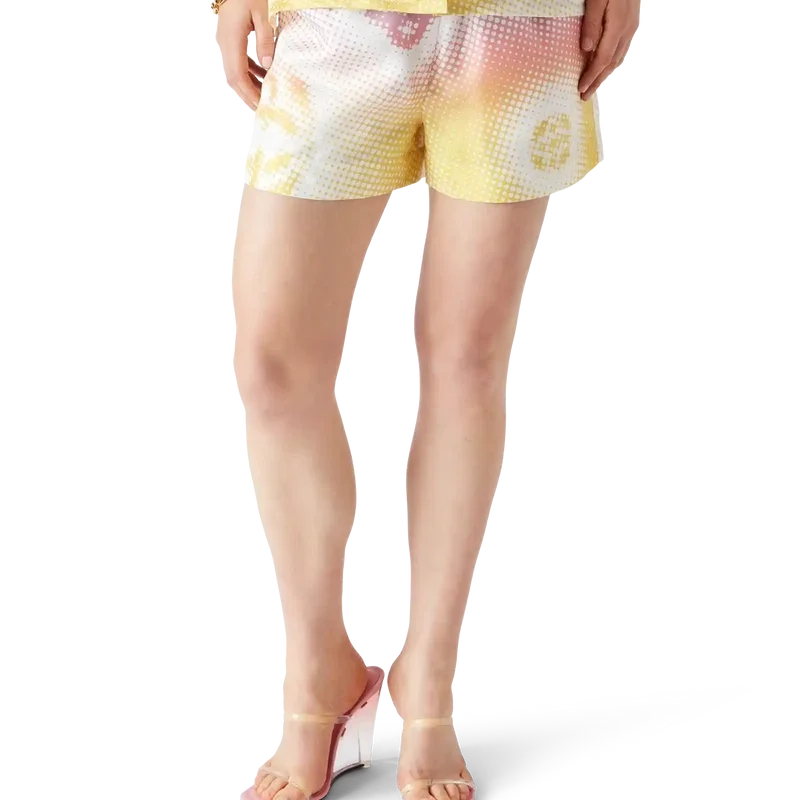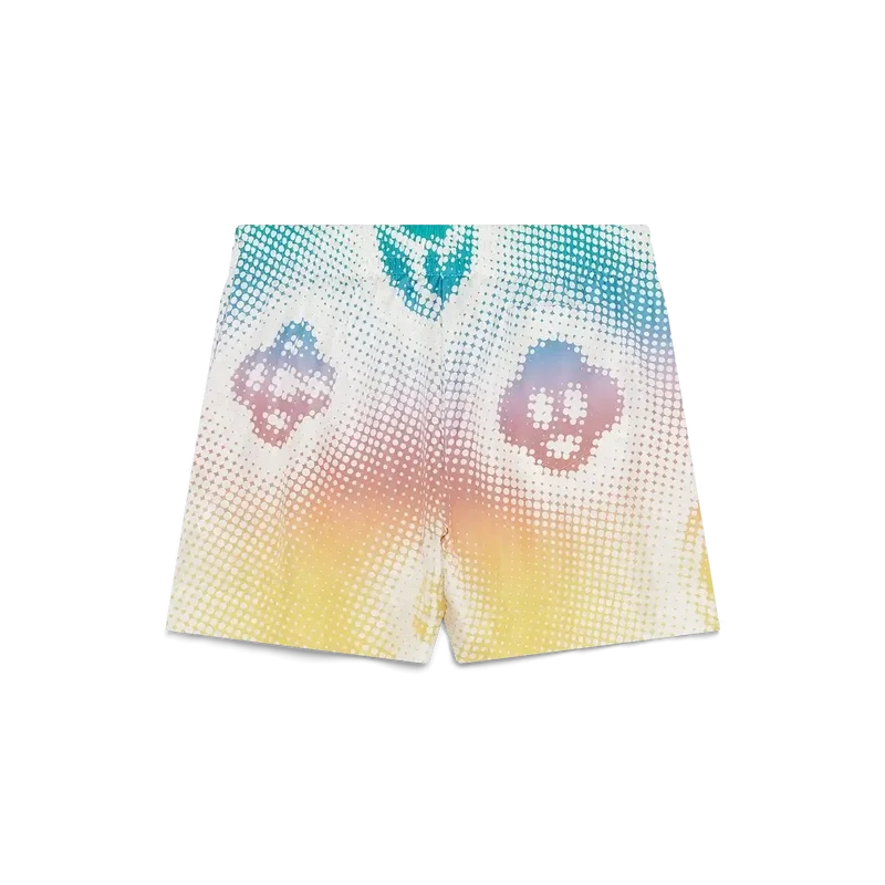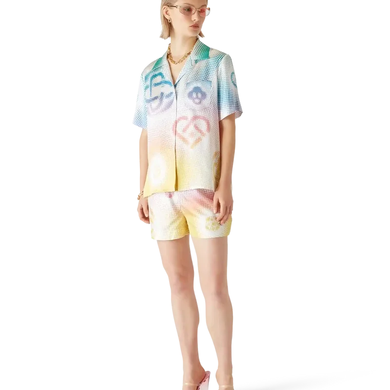 Os calções de seda com logótipo em meio-tom apresentam um design estampado em toda a superfície com a arte dos monogramas da marca, utilizando aerografia, com base nas nossas experiências anteriores com esta técnica. Completados com uma cintura elástica, um bolso de remendo traseiro e bolsos laterais nas costuras.