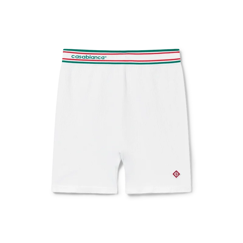 Os calções sem costuras apresentam um design aerodinâmico inspirado no vestuário desportivo, com o padrão de riscas de ténis característico da marca, a marca Casablanca e um emblema com o logótipo em forma de diamante. Confecionados num tecido elástico sem costuras, oferecem uma silhueta refinada com uma construção minimalista. Completam-se com um corte lisonjeador, o logótipo em forma de diamante característico da marca, uma cintura elástica com o logótipo Casablanca da marca e detalhes de riscas.