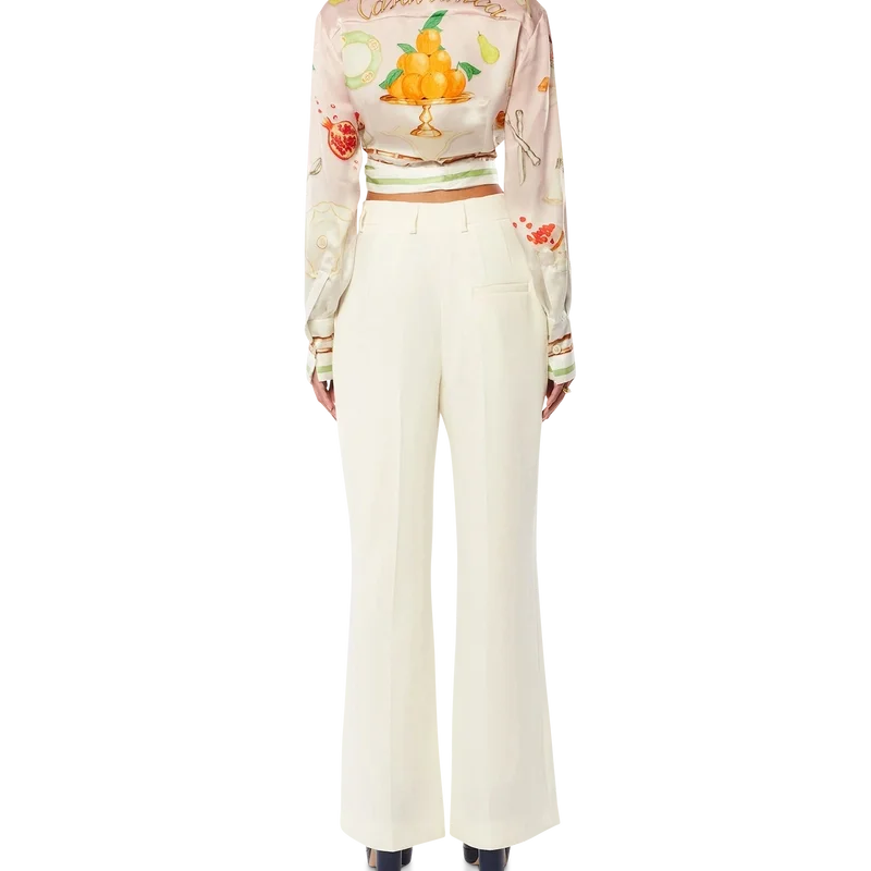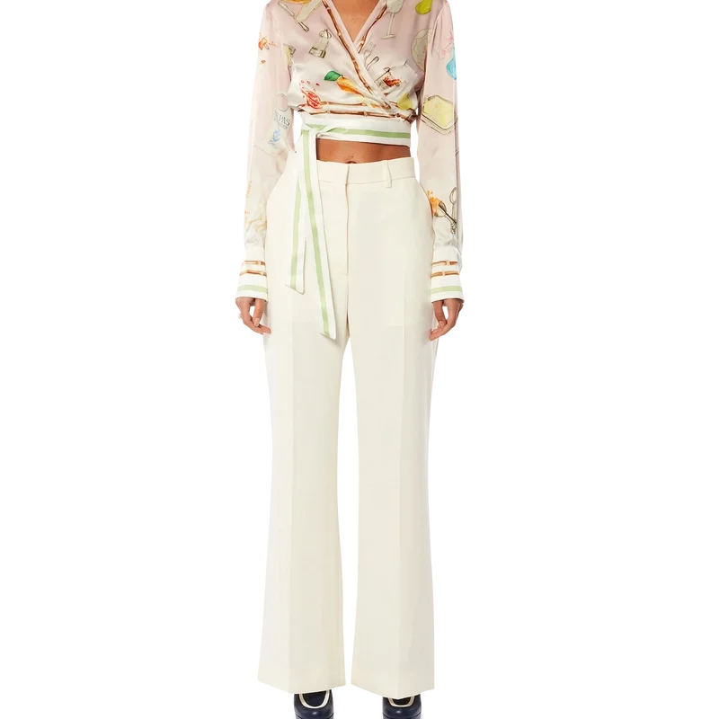 A blusa cruzada Ne Pas Deranger apresenta um design de manga comprida e decote em V, com um estampado integral que destaca a clássica pirâmide laranja icónica da marca. Confecionada em tecido de sarja de seda, esta peça é rematada com um fecho de fita cruzada, detalhes de riscas na gola, punhos, bainha e fita, e uma etiqueta com a marca Casablanca.