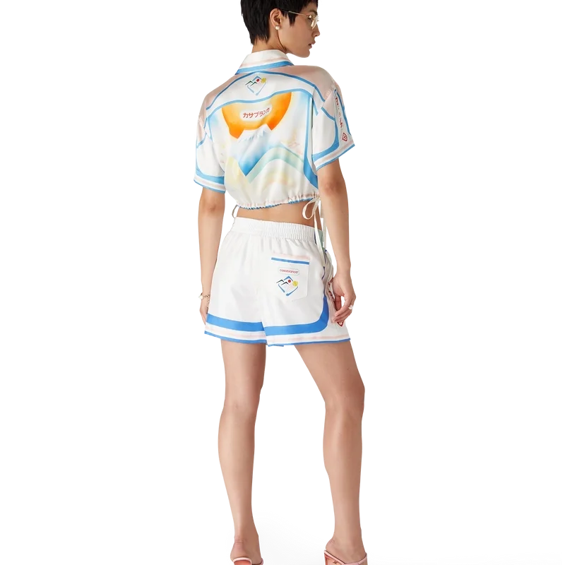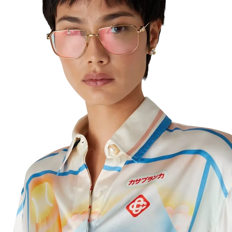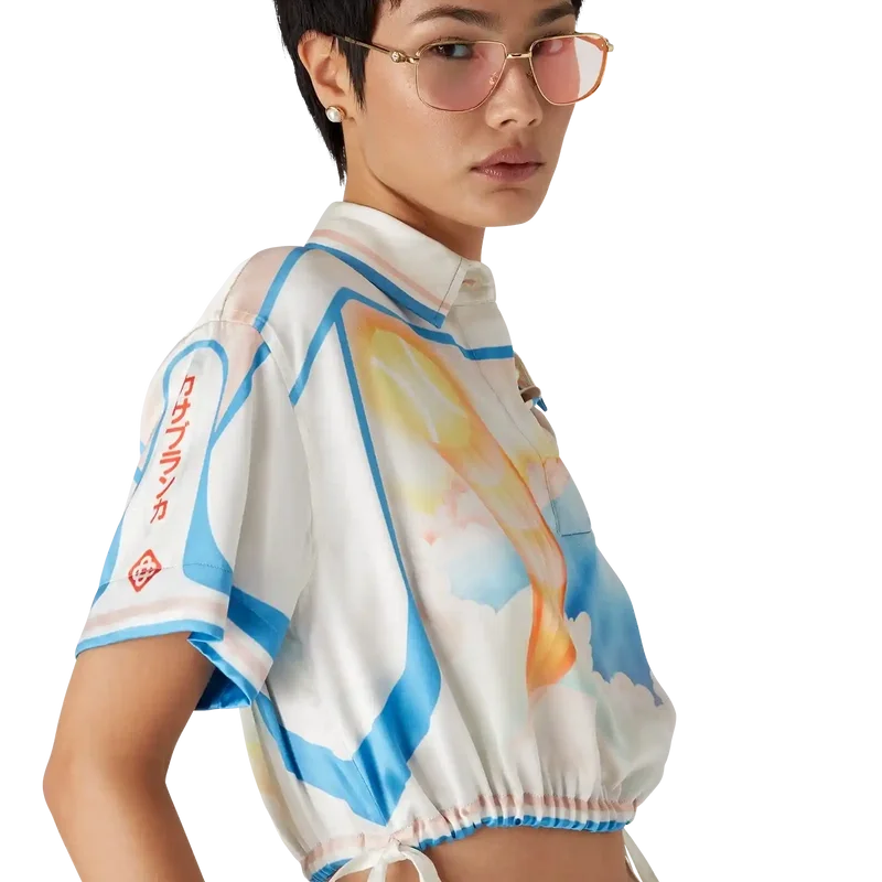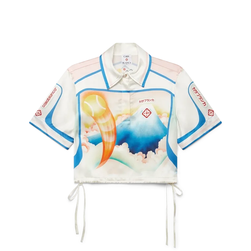 A camisa curta de cetim Fuji Dream é um modelo de manga curta estampado com um desenho que retrata uma visão onírica de uma viagem ao Monte Fuji — confeccionada em tecido de cetim. Apresenta gola em ponta, fecho de botões, botões de corozo com o logótipo Cc entrelaçado e cordões de aperto nas laterais.