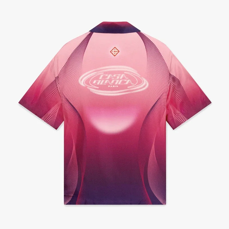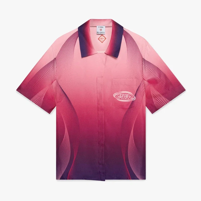 A camisa de seda de calções com gola cubana em degradê rosa apresenta um design estampado, com a arte em degradê da estação que emula as cores ricas da beringela, juntamente com o logótipo Warped da marca e o logótipo de diamante característico. Completada com uma gola cubana, fecho de botões, botões de corozo com o logótipo CC entrelaçado e detalhes de borda em degradê na gola, com uma silhueta descontraída.