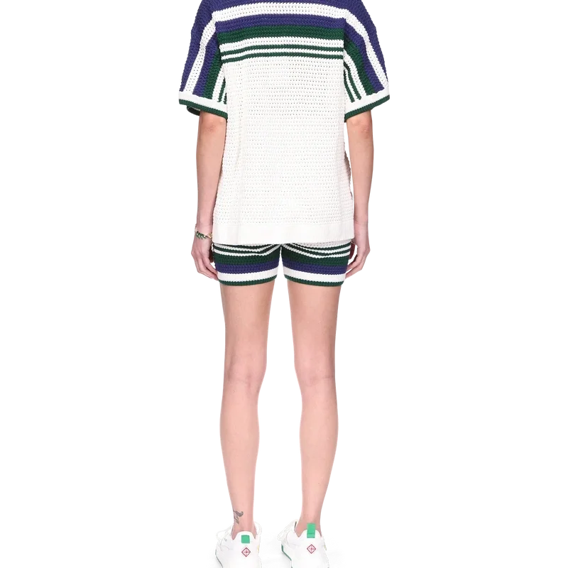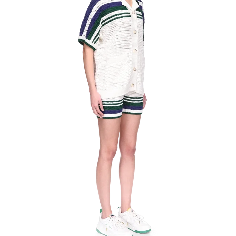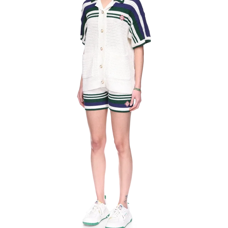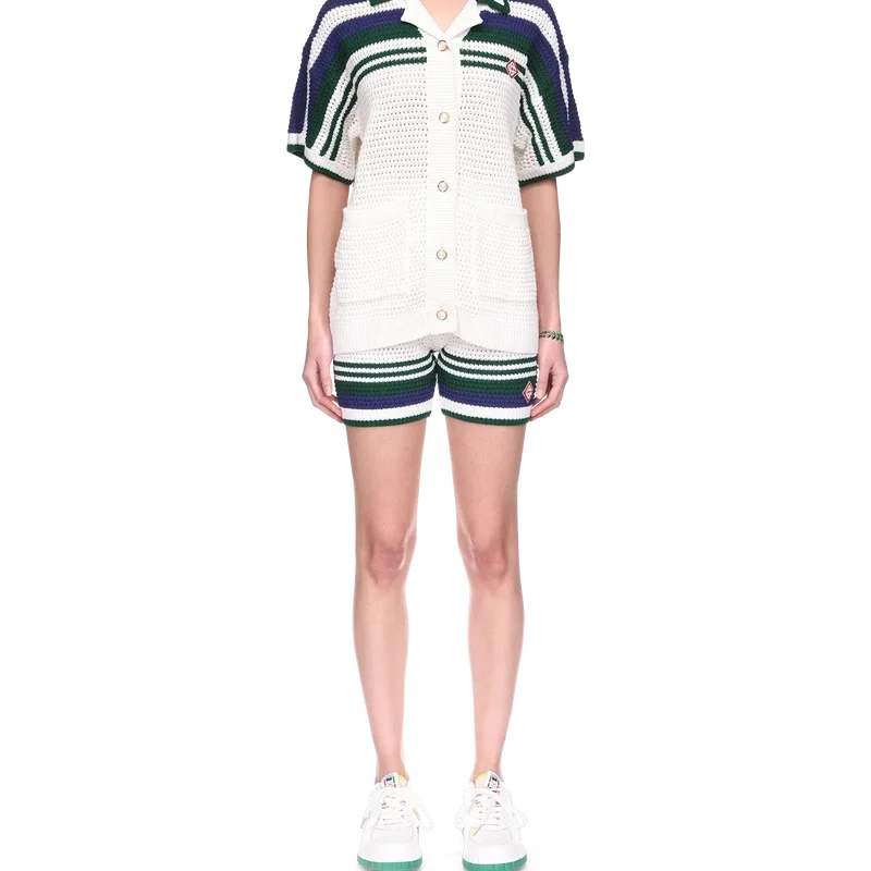 A camisa de ténis em croché para mulher é um modelo em malha de algodão com o logótipo em diamante entrelaçado Cc, emblemático da marca. Apresenta acabamentos com rebordo contrastante na gola e nos punhos canelados, fecho com botões, detalhes em riscas no peito, ombros e mangas, botões em pérola com aro dourado emblemáticos e bolsos de remendo à frente. Branco e Verde