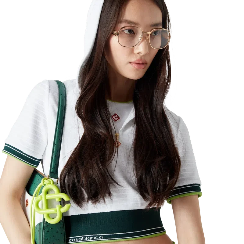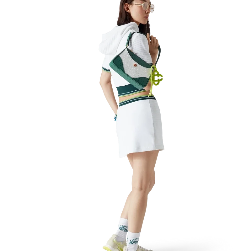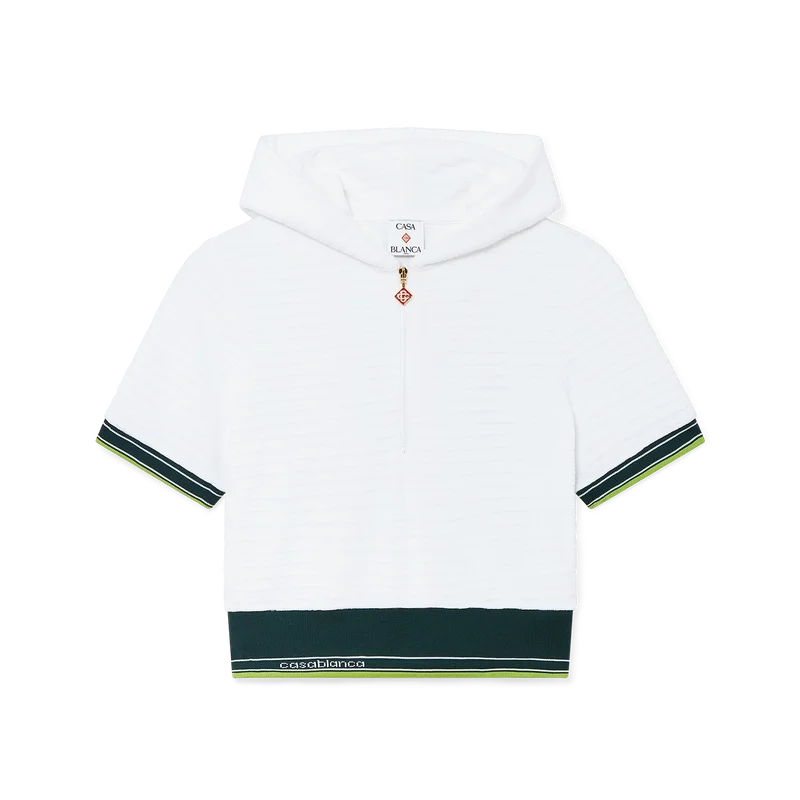 O Top de Calções com Capuz em Veludo Texturado de Ténis é um modelo de manga curta confecionado em tecido de veludo. Apresenta capuz, fecho de zíper de um quarto com o logótipo de diamante característico da marca, punhos canelados em contraste e bainha com detalhes de borda às riscas.