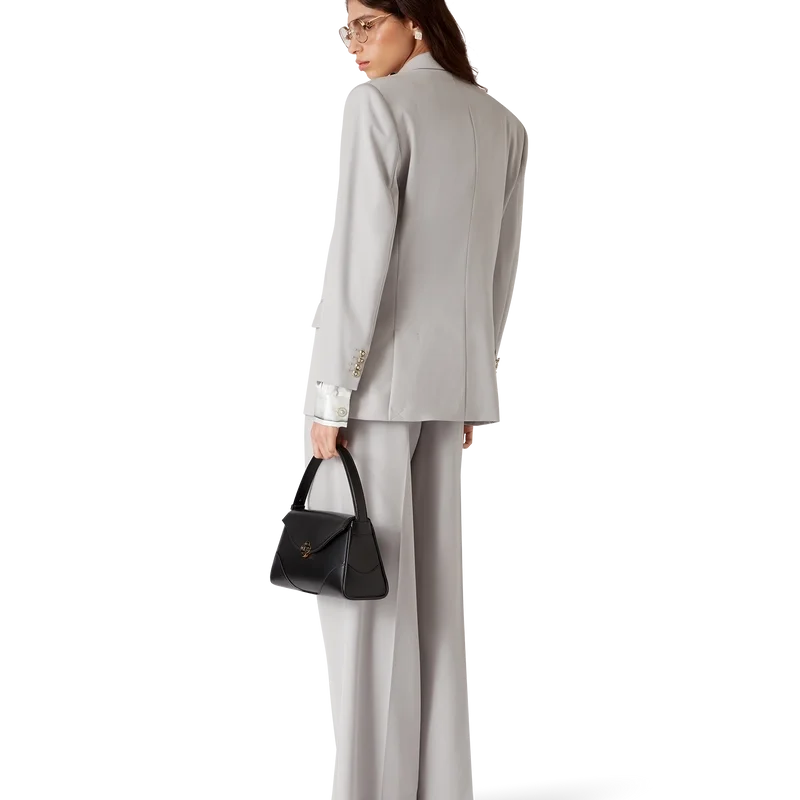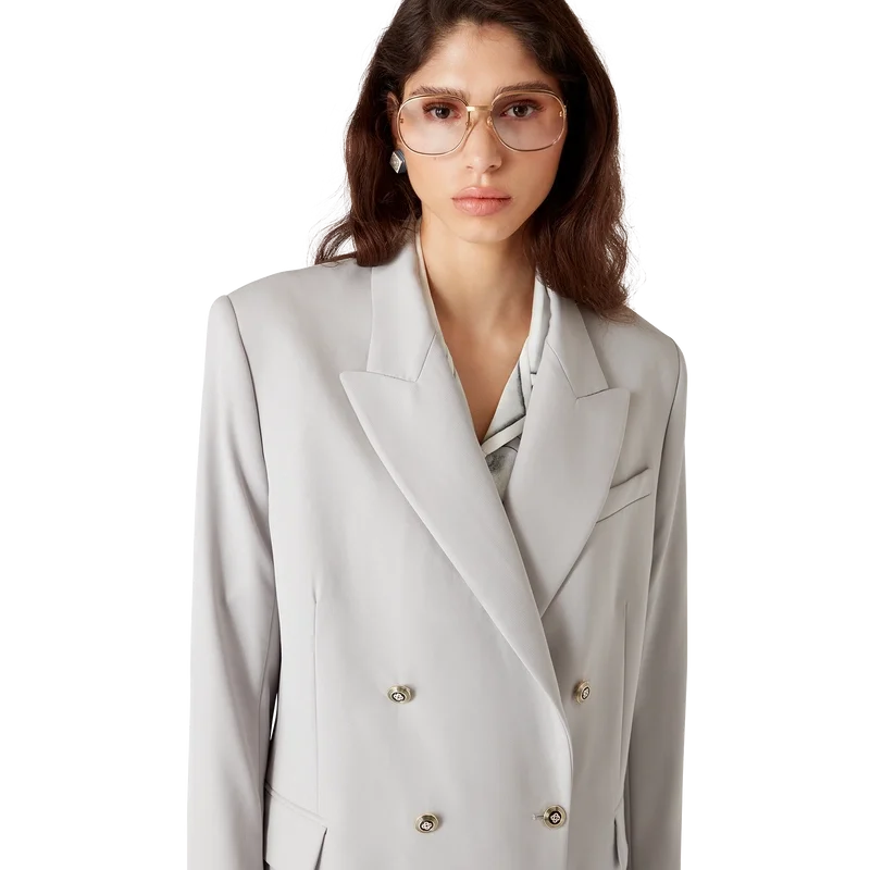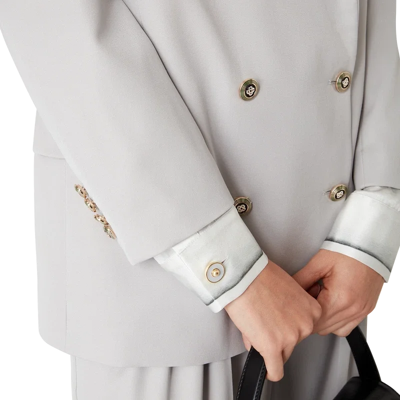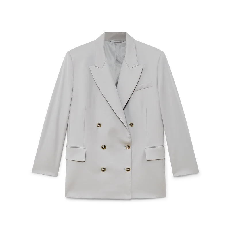 O blazer oversized de lã apresenta um design de botões duplos inspirado em Pat Riley; a influência transformadora que o lendário treinador dos Lakers exerceu sobre o estilo do basquetebol dos anos 80 e 90 reflete-se no vestuário desportivo de corte à medida da coleção, confecionado em tecido de lã virgem. Completo com lapelas em bico, fecho de botões, botões esmaltados CC de haste plana, um bolso de peito com debrum e bolsos frontais com aba.