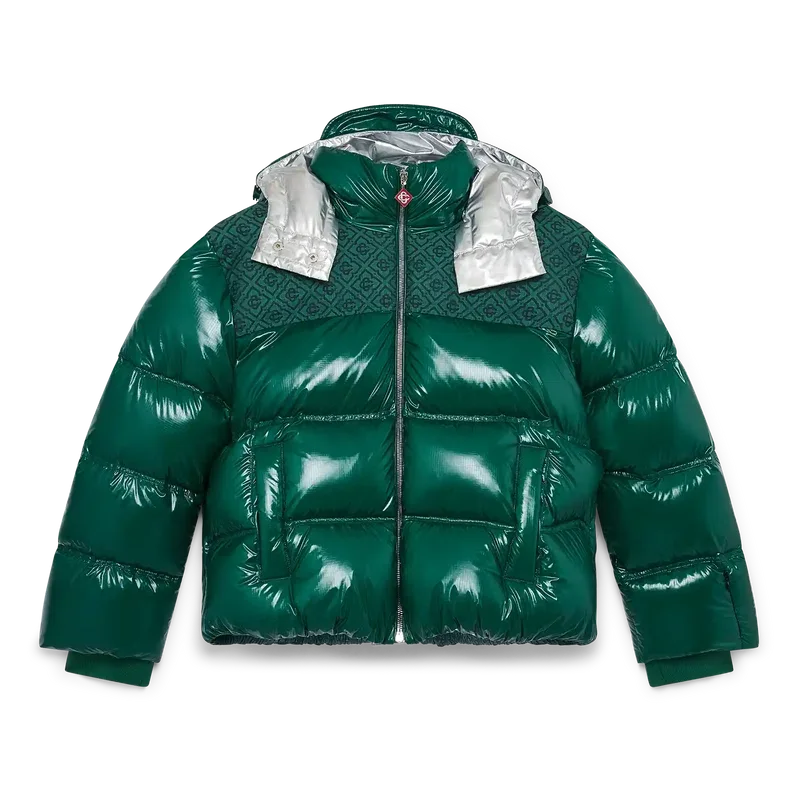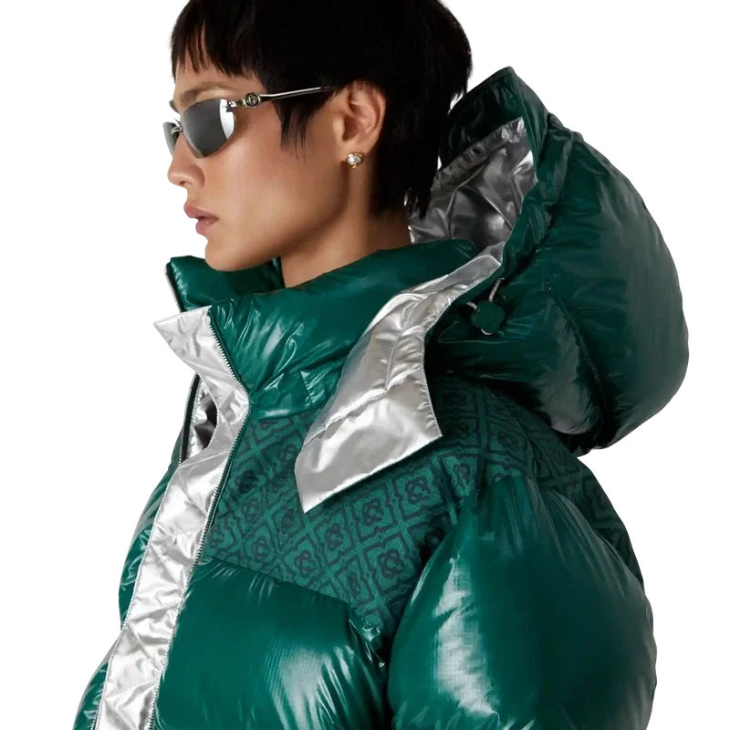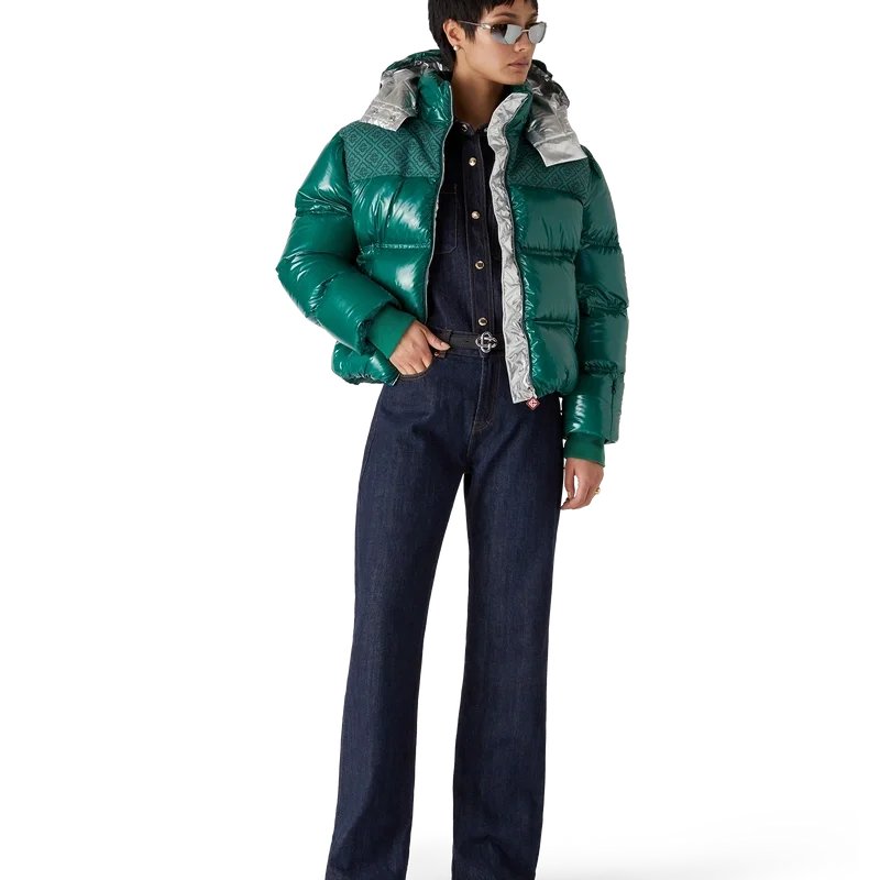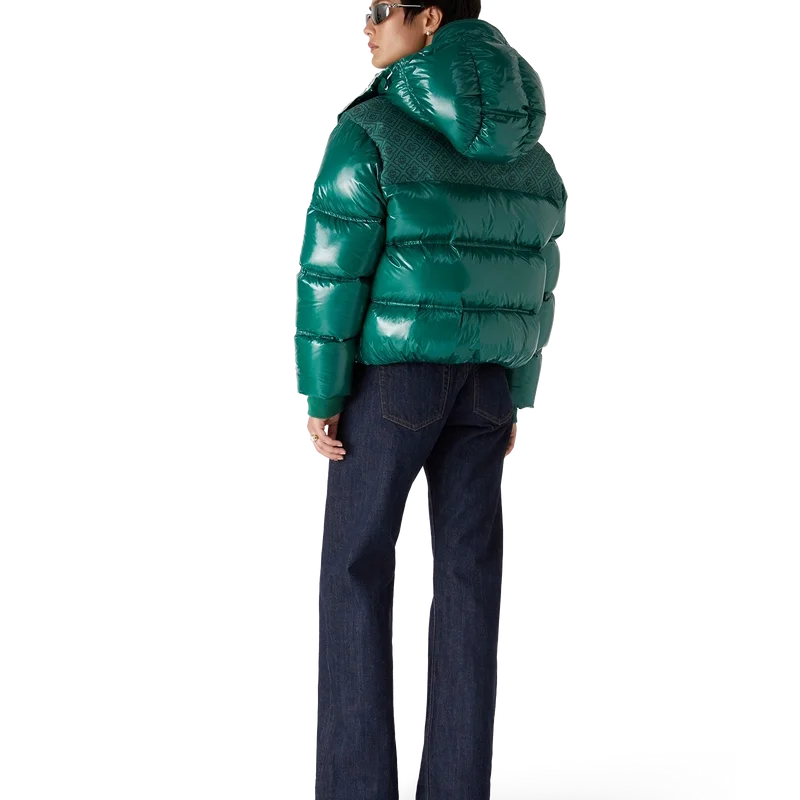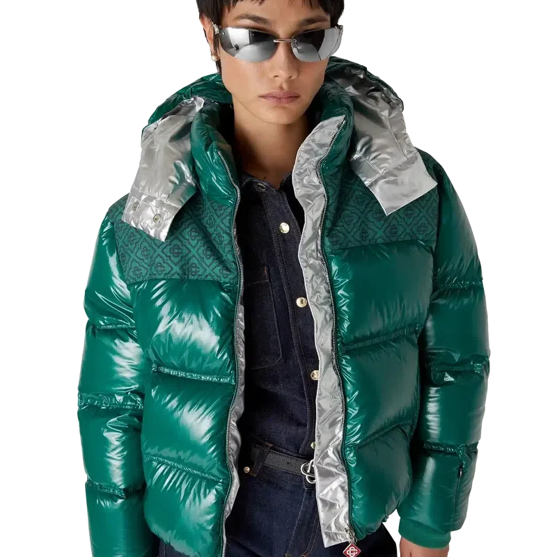 O casaco acolchoado de nylon é um modelo moderno de corte largo, confecionado em tecido de nylon ripstop com enchimento de penas e painel jacquard com monograma contrastante nos ombros. Completa-se com um capuz com cordões com logótipo CC e fechos de cordão, uma gola alta que proporciona calor extra e proteção contra as intempéries, um fecho de correr com a aba com o logótipo de diamante característico da marca, bolsos frontais com fecho de correr, punhos ajustáveis com a marca e bainha e punhos elásticos.