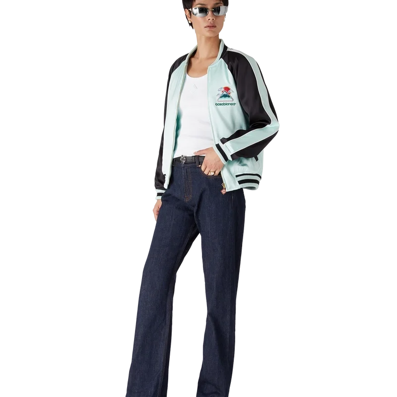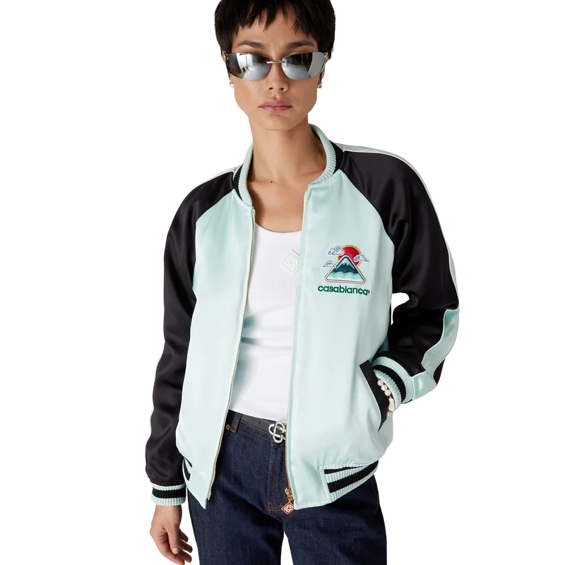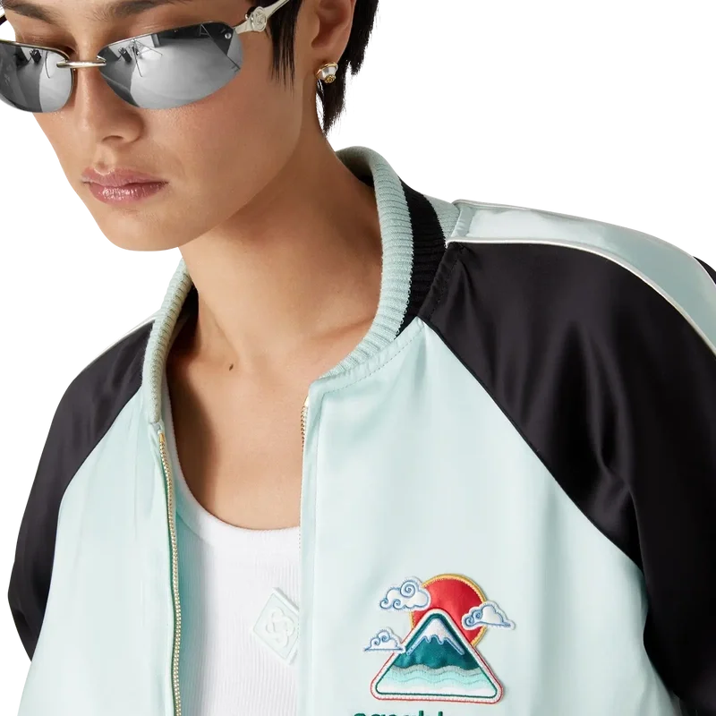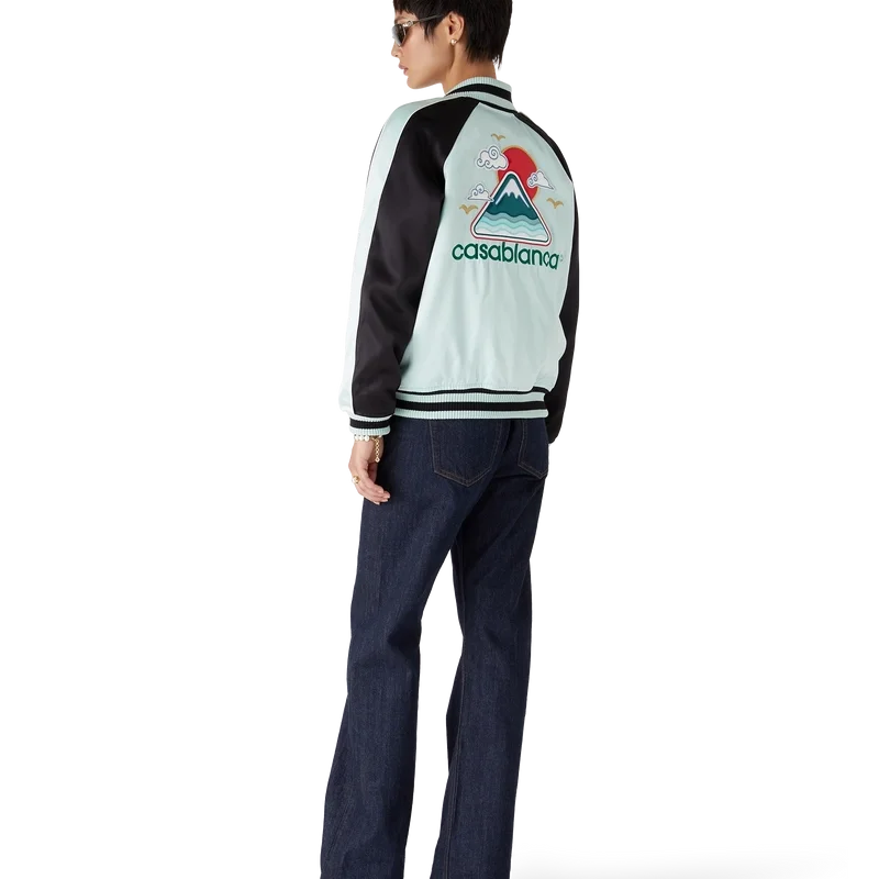 O casaco bomber de cetim bordado é um casaco tradicional de estilo bomber, confecionado em tecido de cetim com desenhos inspirados na rica iconografia japonesa, transmitindo uma forte mensagem visual com apenas algumas linhas e cores, tornando-o num dos emblemas da coleção. Concluída com fecho de correr com a aba com o logótipo de diamante característico da marca, mangas raglan com painéis verdes e pretos e detalhes de debrum, forro, bolsos diagonais com debrum e gola alta canelada, punhos e bainha com detalhes de riscas em menta e preto.