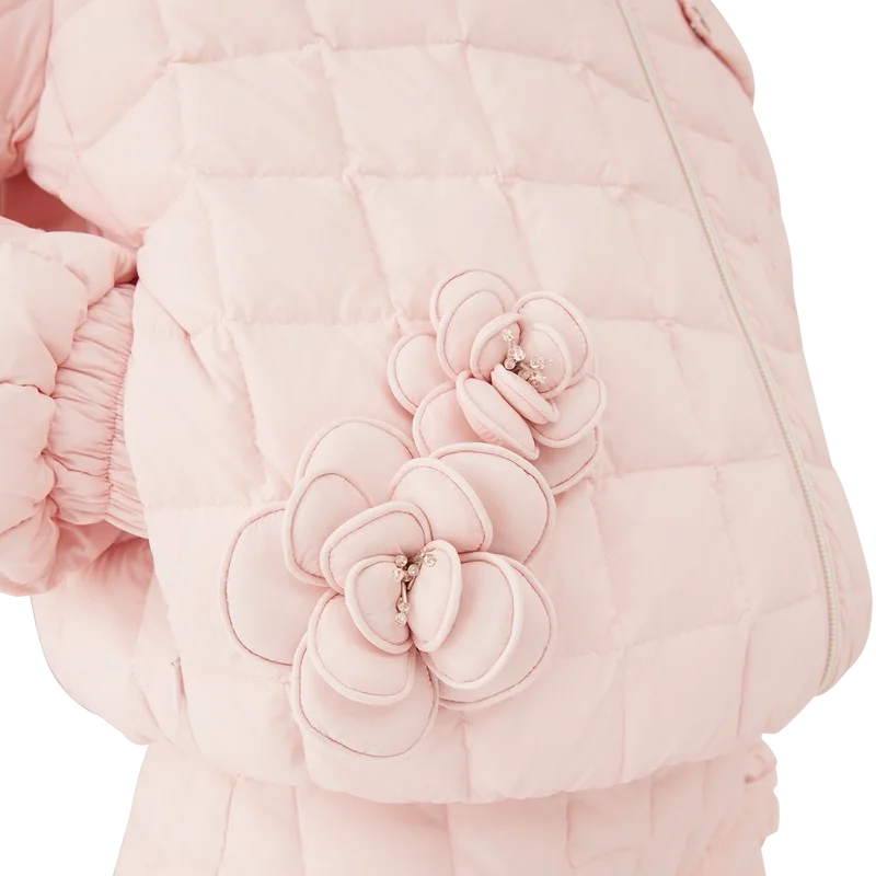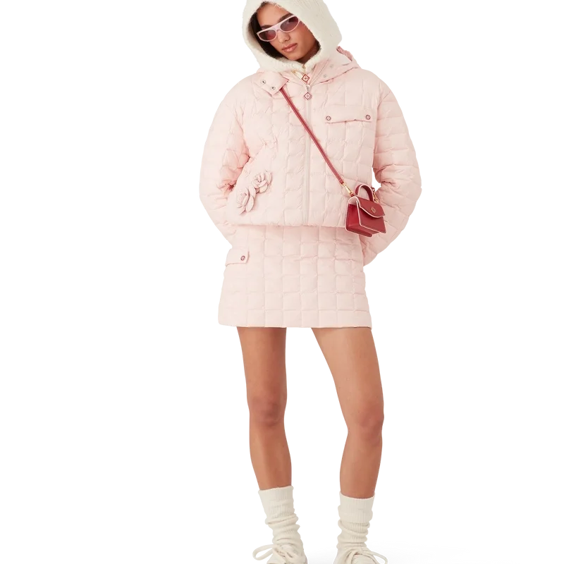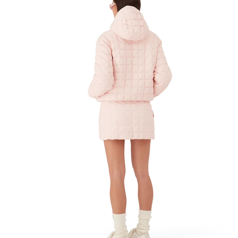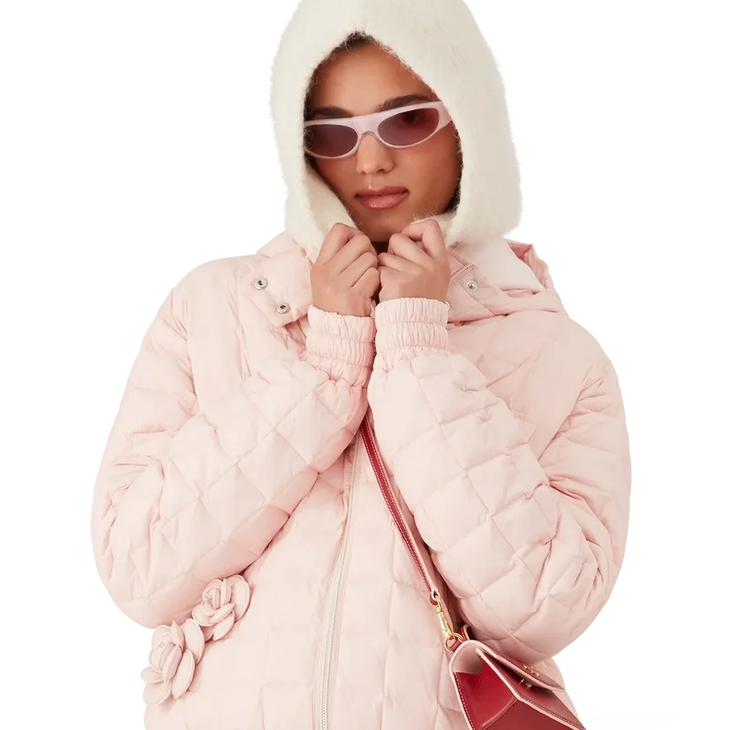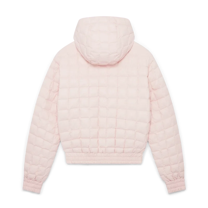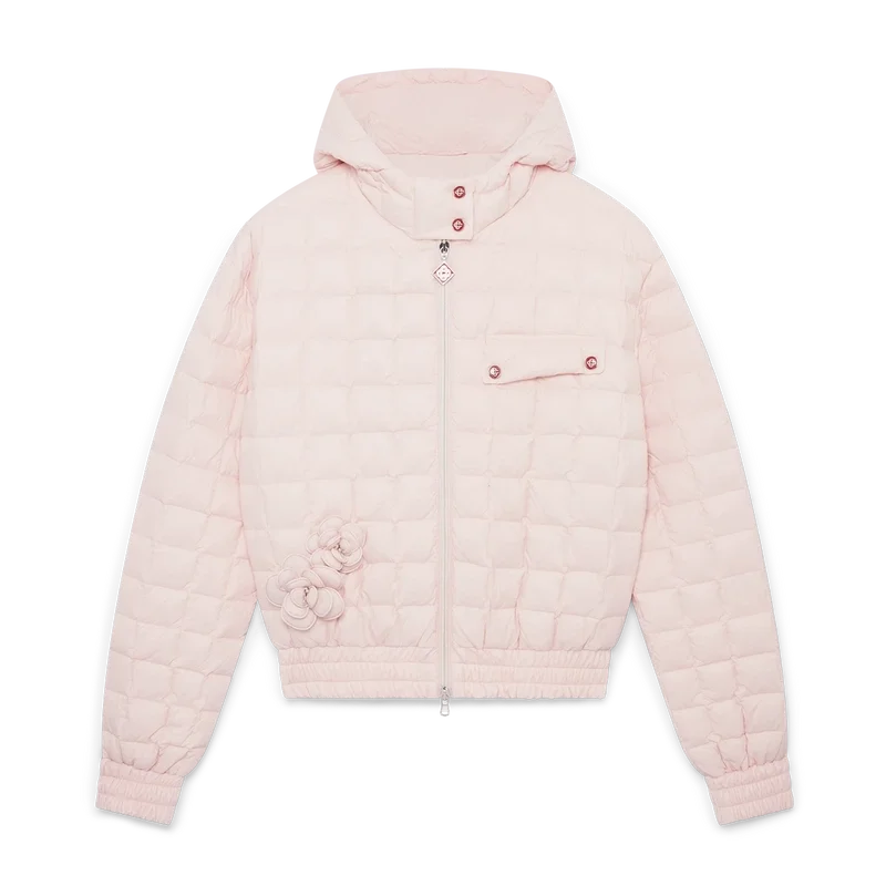 O casaco com capuz acolchoado em nylon é um modelo de manga comprida com um padrão acolchoado quadrado. Completo com capuz, fecho de correr, bolso com aba com os botões de pressão planos esmaltados banhados a ouro com o logótipo entrelaçado da marca, e punhos e bainha elásticos.