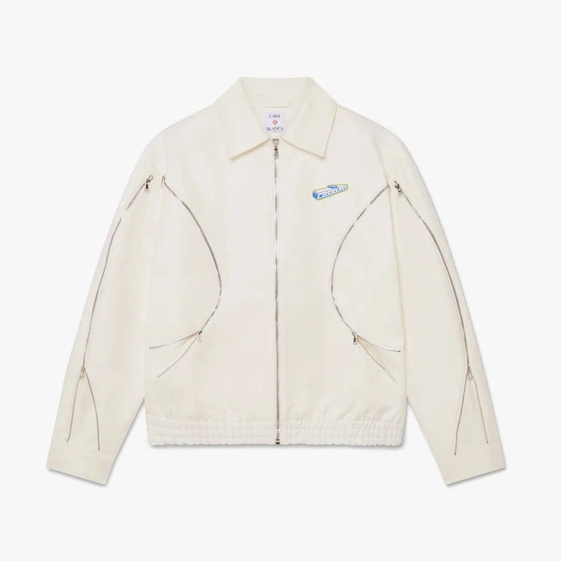 O Casaco de Dril de Algodão Branco com Fecho é um modelo requintado, confecionado em tecido de dril de algodão resistente num branco imaculado. Apresenta fecho de correr com a aba com o logótipo Warped da marca, gola em ponta, bolsos frontais com fecho de correr, detalhes de fecho nas mangas e uma silhueta descontraída que incorpora os códigos desportivo-lazer da marca.
