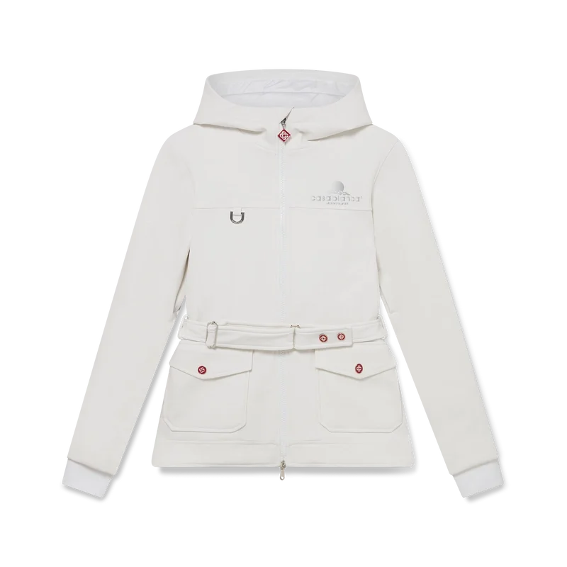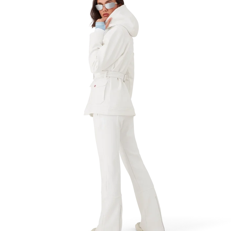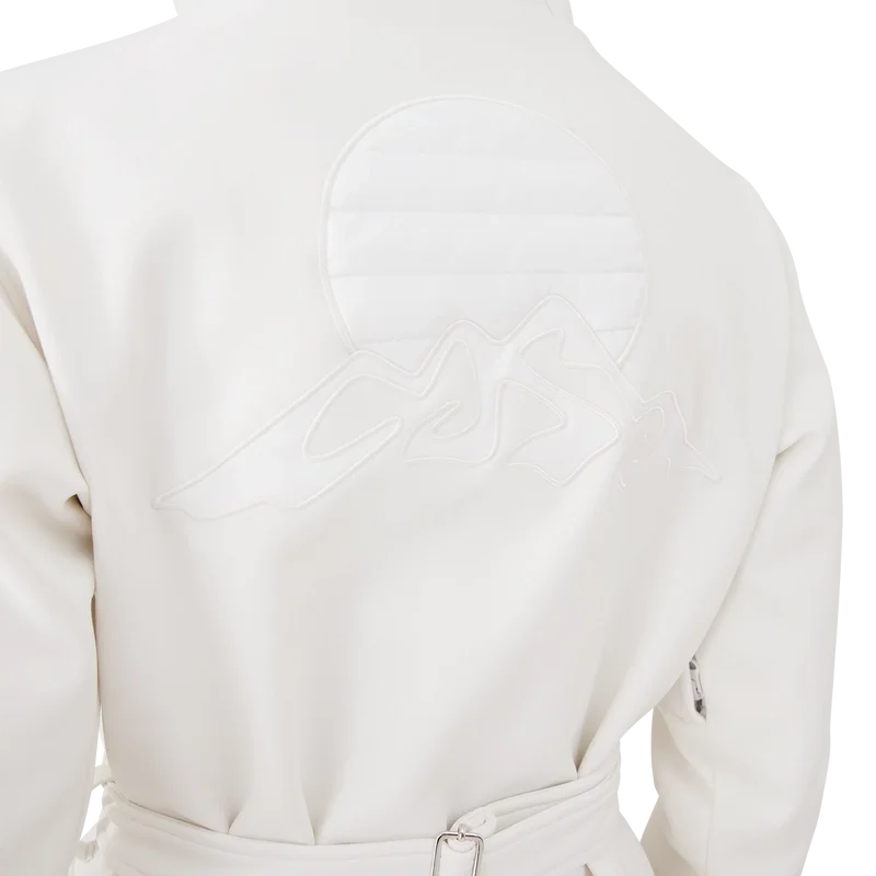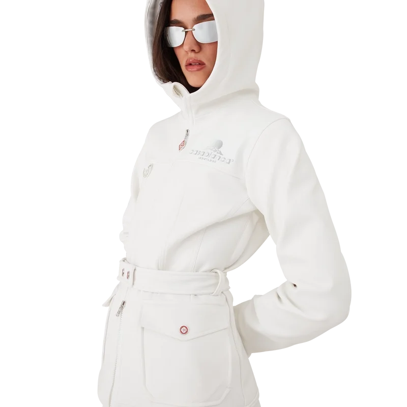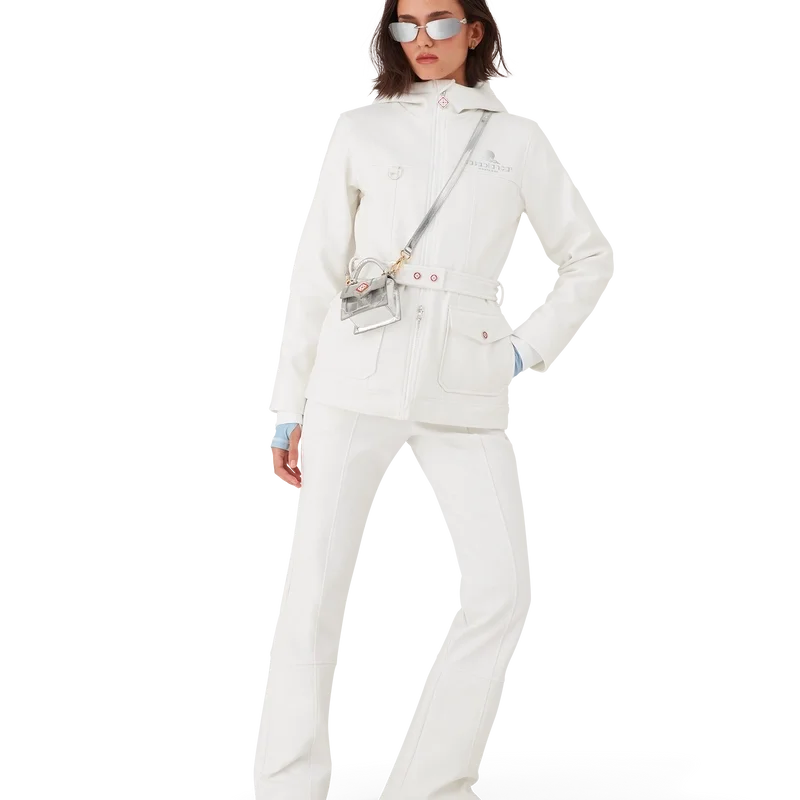 O casaco de esqui é um modelo de casaco requintado, confecionado em tecido polar branco, inspirado nas texturas suaves da paisagem rural japonesa no inverno. As paisagens geladas e os bosques de bambu cobertos de neve criam corredores brancos serenos. Este modelo apresenta a arte sazonal Casa Montagne da marca nas costas. Completada com um capuz com cordões com o logótipo CC e fechos de cordão, uma gola alta que proporciona calor extra e proteção contra as intempéries, um fecho de correr com a aba com o logótipo de diamante característico da marca, bolsos frontais com fecho em metal prateado, cintas de cinto ajustáveis com a marca e bainha e punhos elásticos.