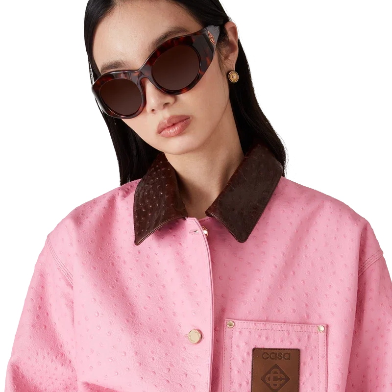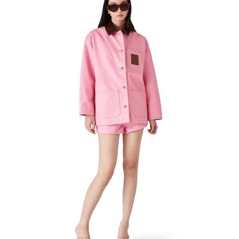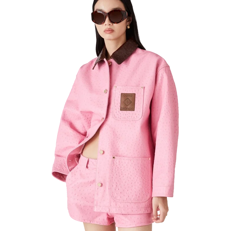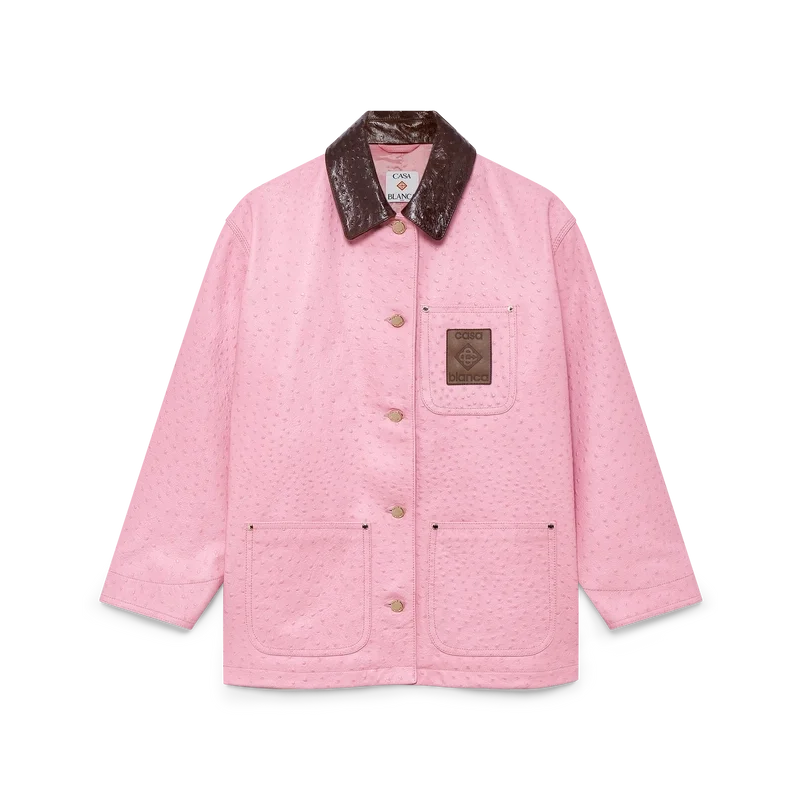 O casaco de trabalho em pele com relevo apresenta um design descontraído e informal, confecionado em pele de bezerro italiana. Apresenta um padrão estampado com efeito de pele de avestruz, gola em contraste, bolso no peito com um emblema em pele com a marca, bolsos de remendo na frente, fecho de botões e ferragens banhadas a ouro.