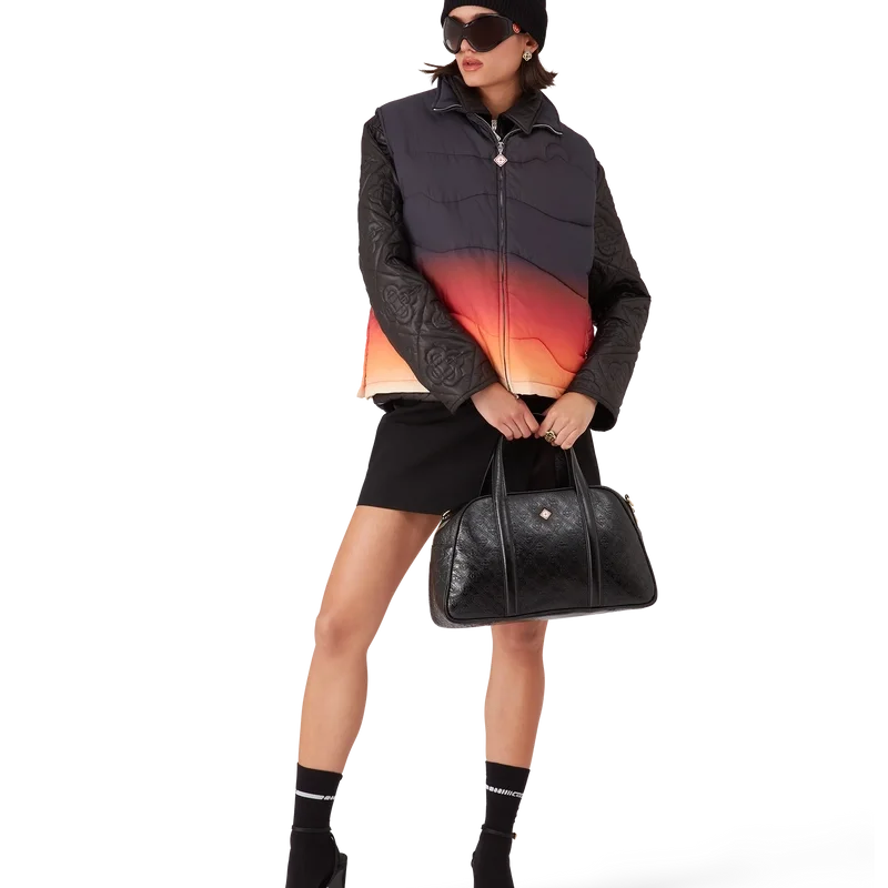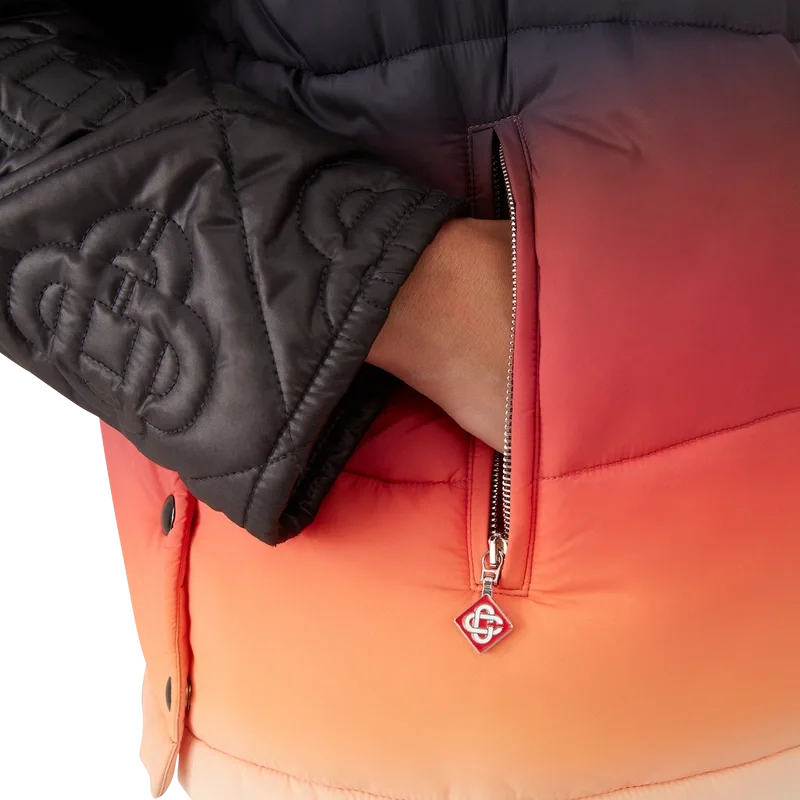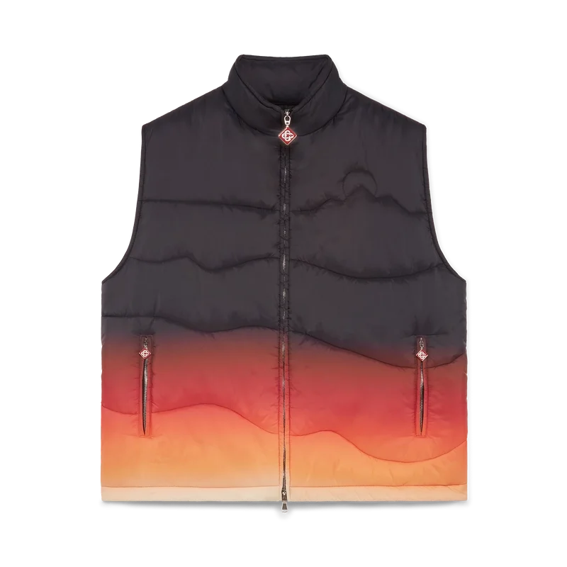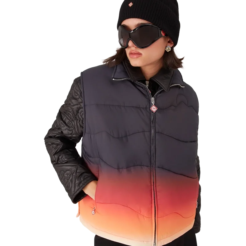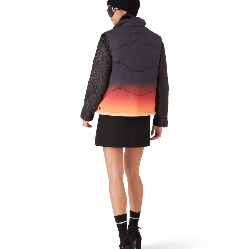 O colete acolchoado em nylon com efeito gradiente é um design de casaco refinado, confecionado em tecido de nylon com estampado gradiente, inspirado nas transições de cor de tirar o fôlego do amanhecer e do anoitecer sobre a paisagem rural coberta de neve do Japão. Evoca momentos espetaculares em que céus vibrantes iluminam paisagens montanhosas rurais e as aldeias brilham contra cenários alpinos dramáticos.