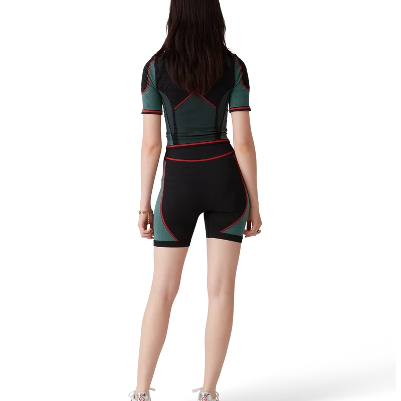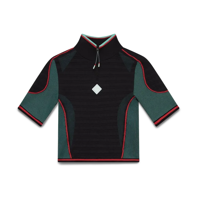 A camisa sem costuras com meio fecho é um modelo de manga curta inspirado no vestuário desportivo, confeccionado num tecido elástico canelado sem costuras. Apresenta fecho de correr, gola polo e ostenta o logótipo em diamante da marca e detalhes em painéis.