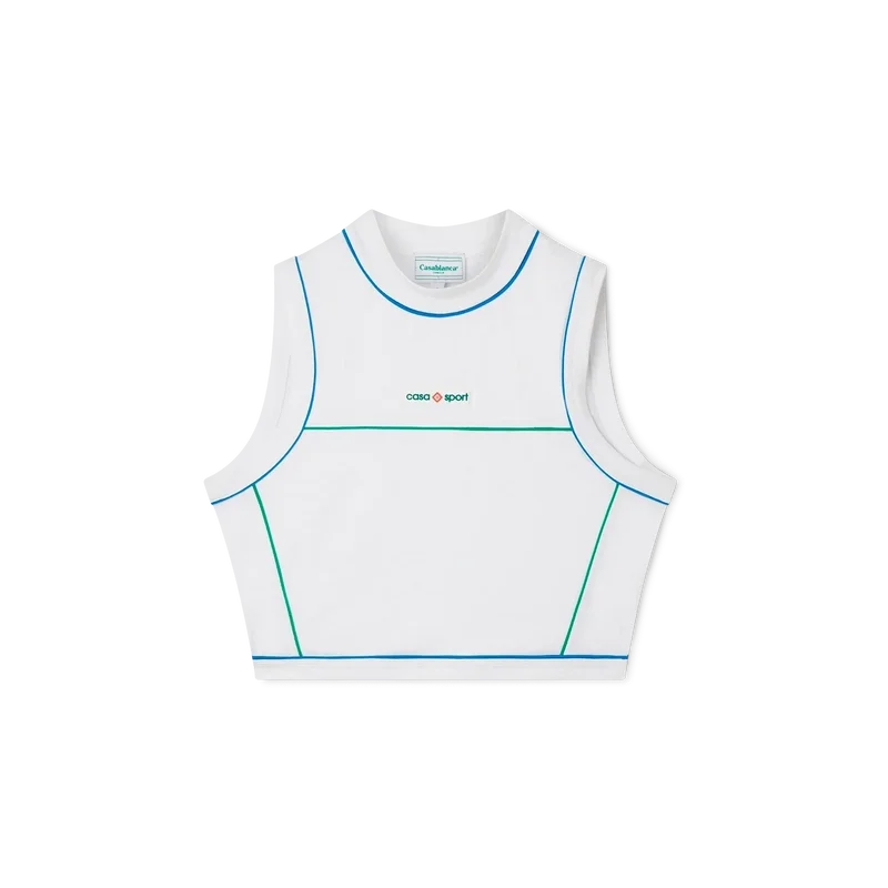 O colete Casa Sport com gola alta é uma peça de roupa desportiva sem mangas, confeccionada num tecido de mistura de poliéster e elastano, com o logótipo Casa Sport no peito. Apresenta uma gola alta e detalhes de debrum contrastante à volta do pescoço, peito, cavas e cintura.