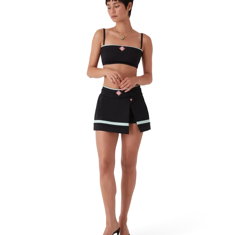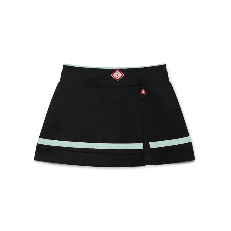 Uma mini-saia em tricô é um modelo curto de inspiração desportiva, com o Diamond Monogram característico da marca no centro. Apresenta uma cintura em malha canelada, um botão com logótipo CC de haste plana, calções interiores justos, uma abertura lateral, detalhes na bainha com riscas horizontais em preto, branco, menta e vermelho e fecho de correr lateral.