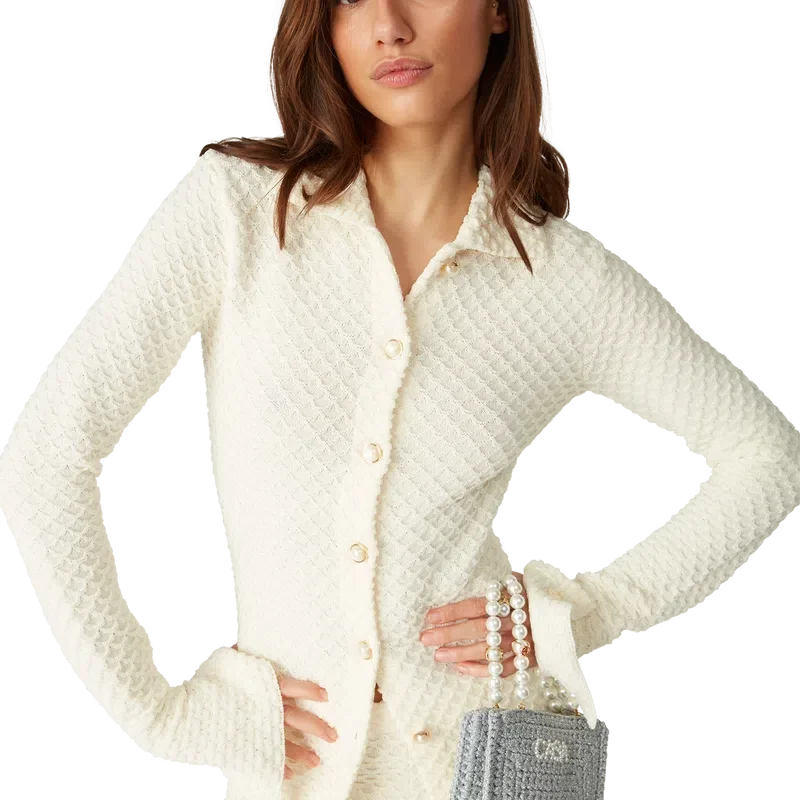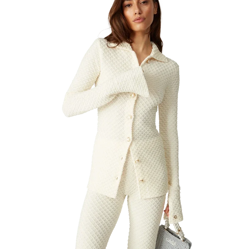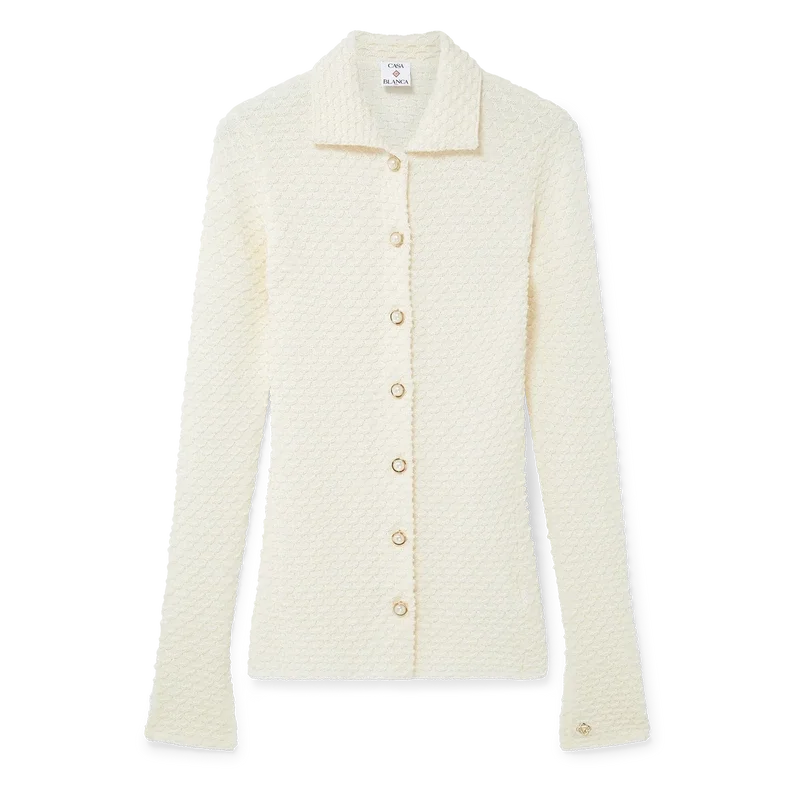 A camisa de malha texturada é um modelo de manga comprida confeccionado em tecido de mistura de algodão. Apresenta gola, mangas largas com fenda, fecho de botões à frente, botões de pérola com aro dourado exclusivos e um rebite Cc entrelaçado banhado a ouro.