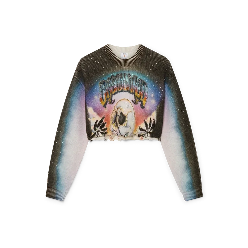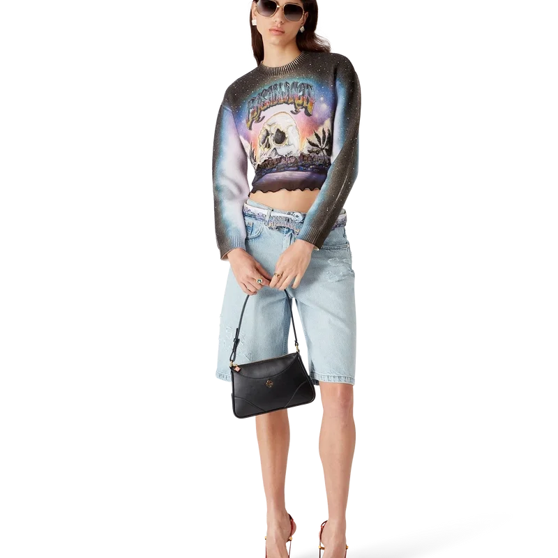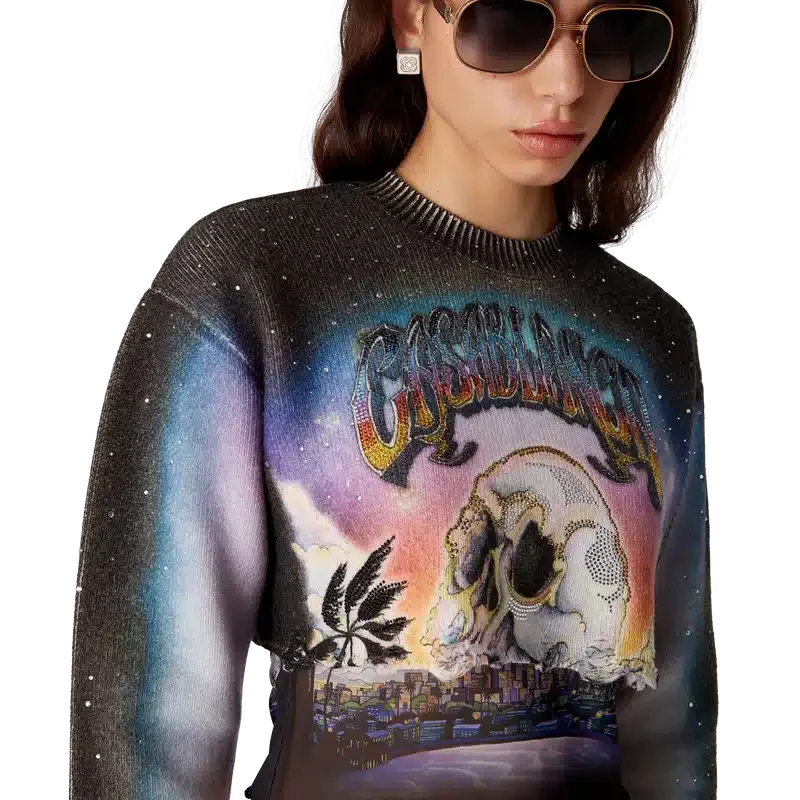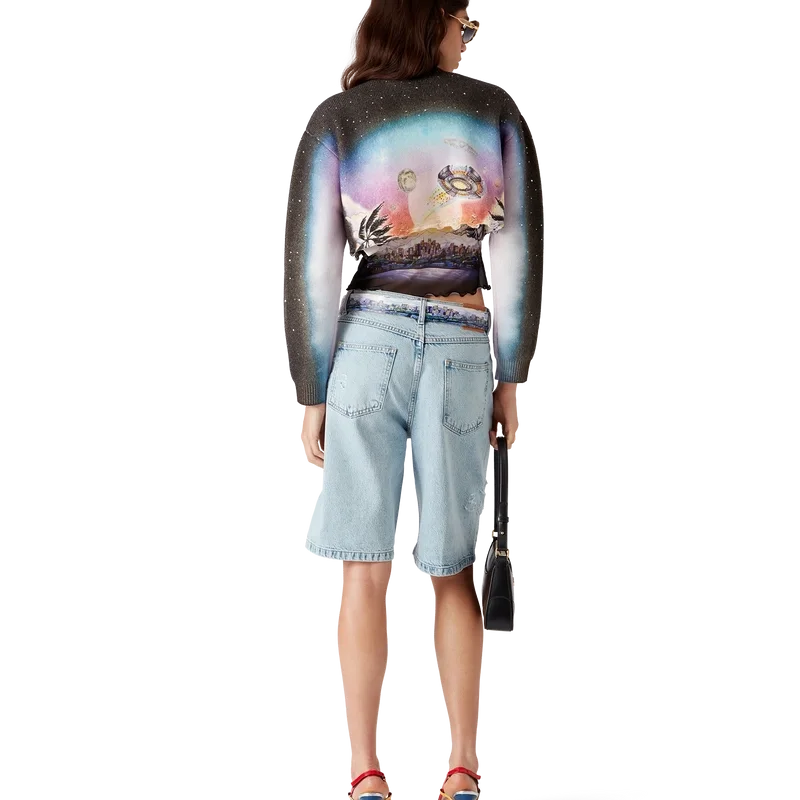 A Camisola de Calções em Mistura de Caxemira da La Pramonition é um modelo curto de manga comprida, confeccionado num tecido de lã estampado com a arte da estação, inspirada numa visão misteriosa do horizonte de Los Angeles à noite, com elementos de OVNIs que remetem para a inspiração da ficção científica vintage. Completada com um clássico decote redondo canelado e punhos canelados.