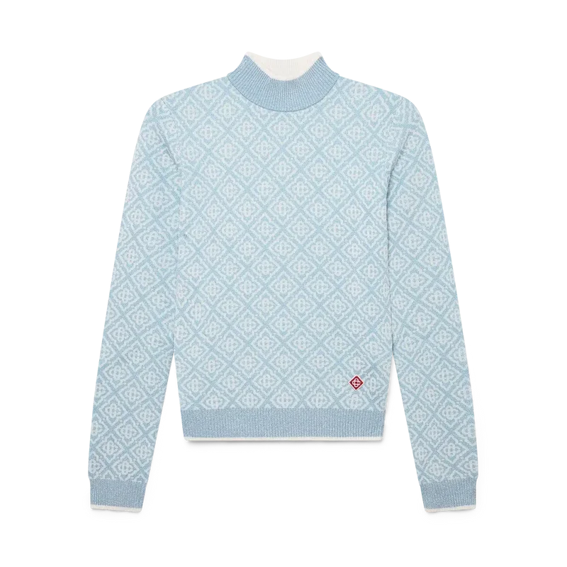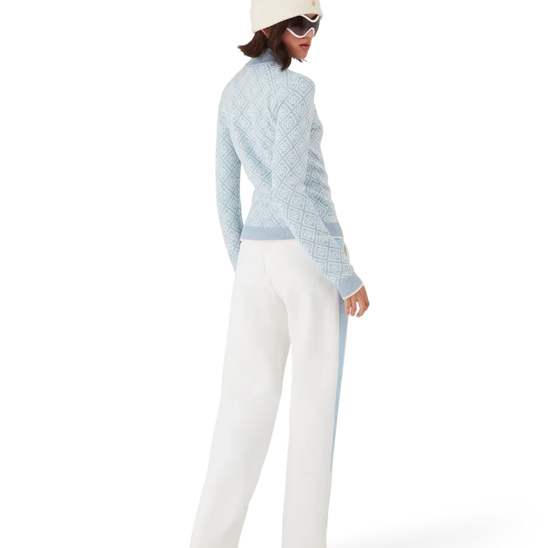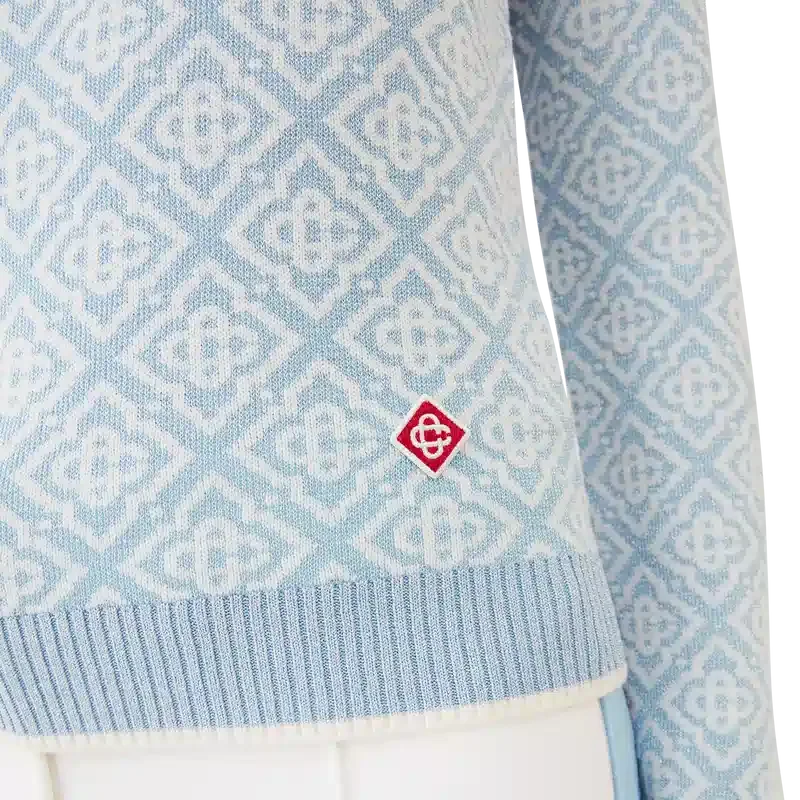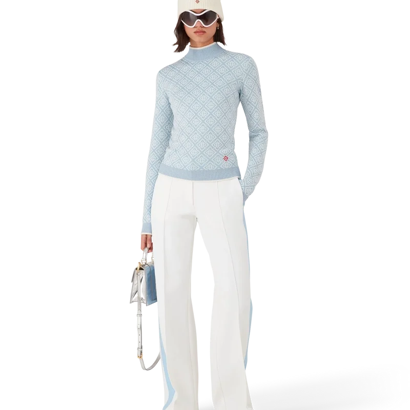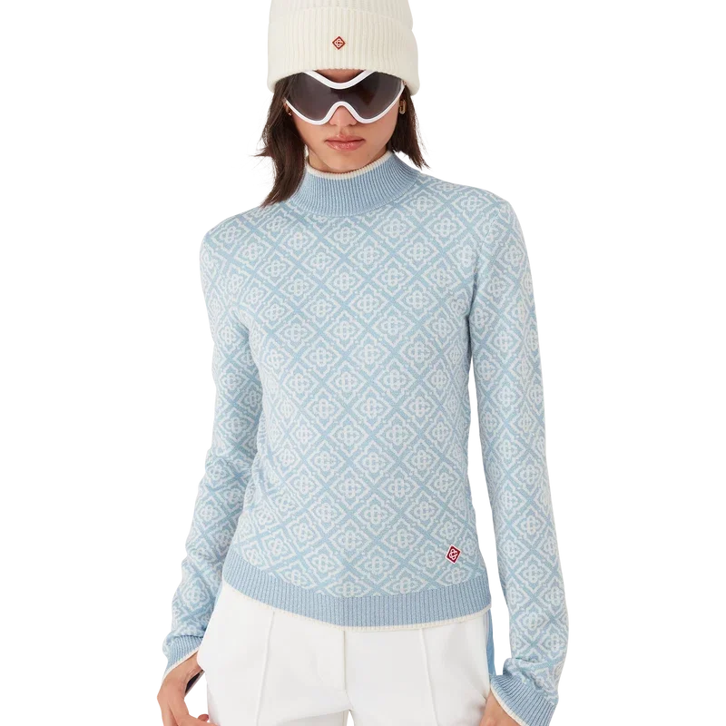 A Camisola de Gola Alta Ski Monogram é um design desportivo-casual requintado, confeccionado em tecido de lã merino, apresentando o motivo monograma azul e branco característico da marca, inspirado nos padrões tradicionais japoneses de inverno. Inspirada na beleza intricada dos cristais de gelo nas janelas dos templos e na geometria rítmica das cercas rurais cobertas de neve.
