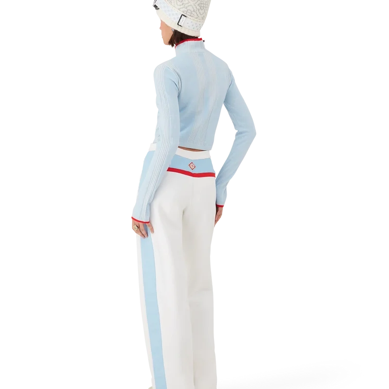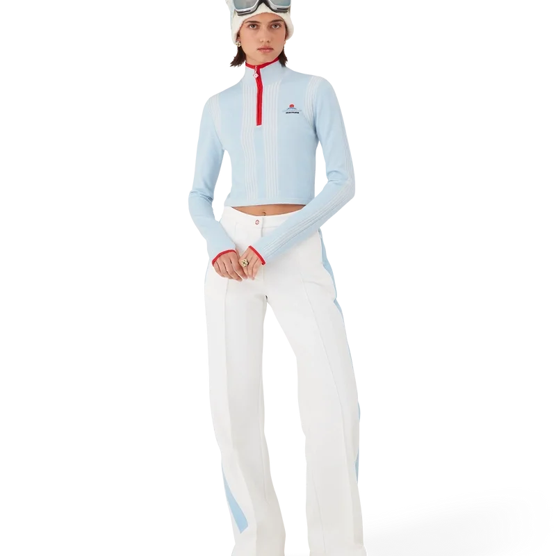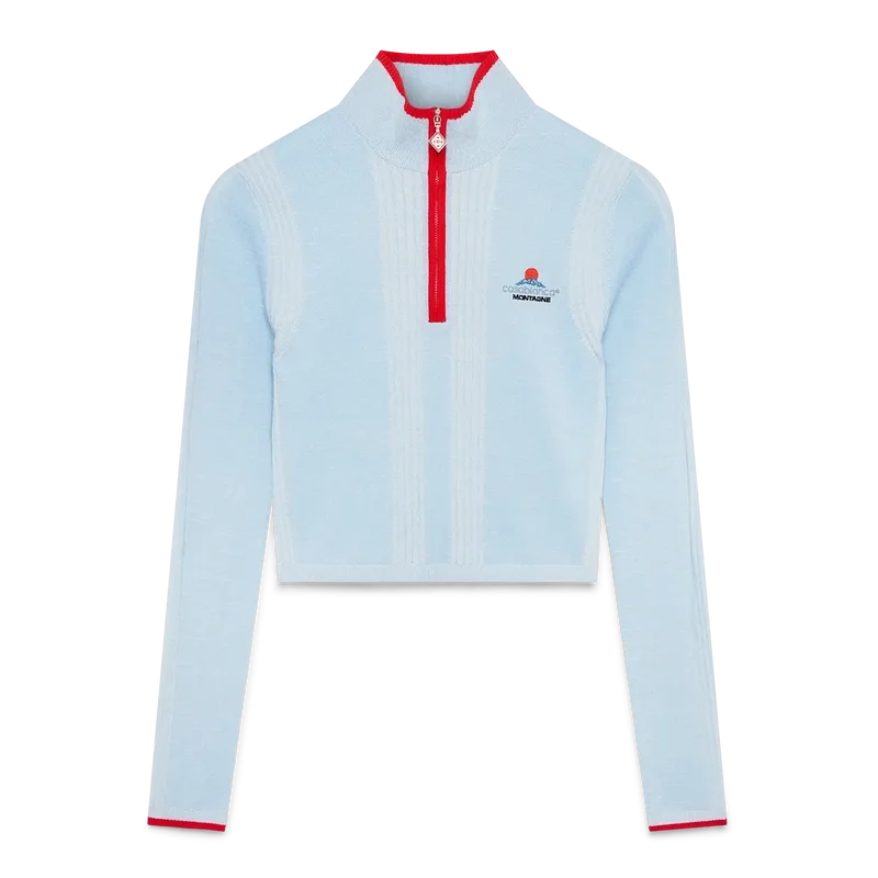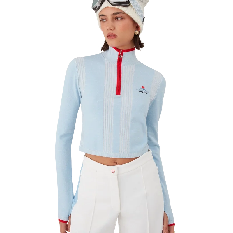 O top curto de camada base em lã merino para esqui é um design desportivo-casual requintado, confecionado em tecido de lã merino azul, inspirado no crepúsculo profundo que se instala sobre a paisagem montanhosa do Japão. Inspirando-se na beleza serena da luz do entardecer que projeta sombras azuis sobre vales cobertos de neve, o design combina elegância desportiva e casual.