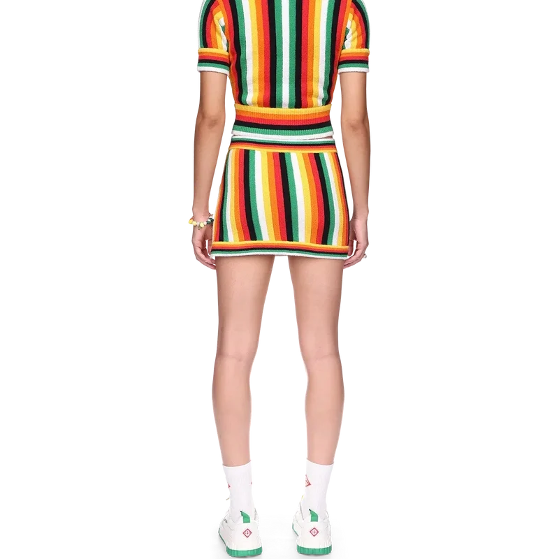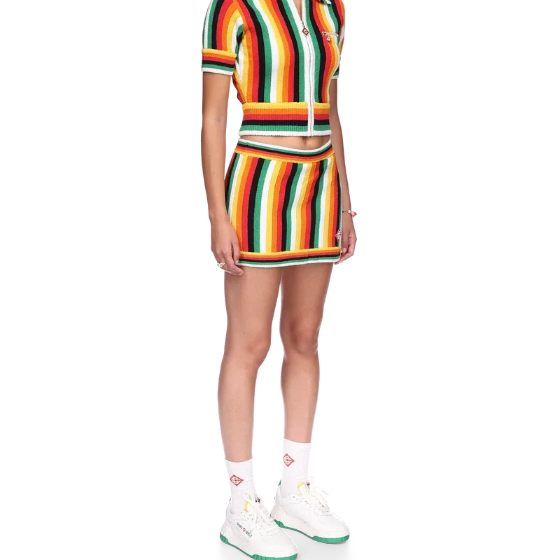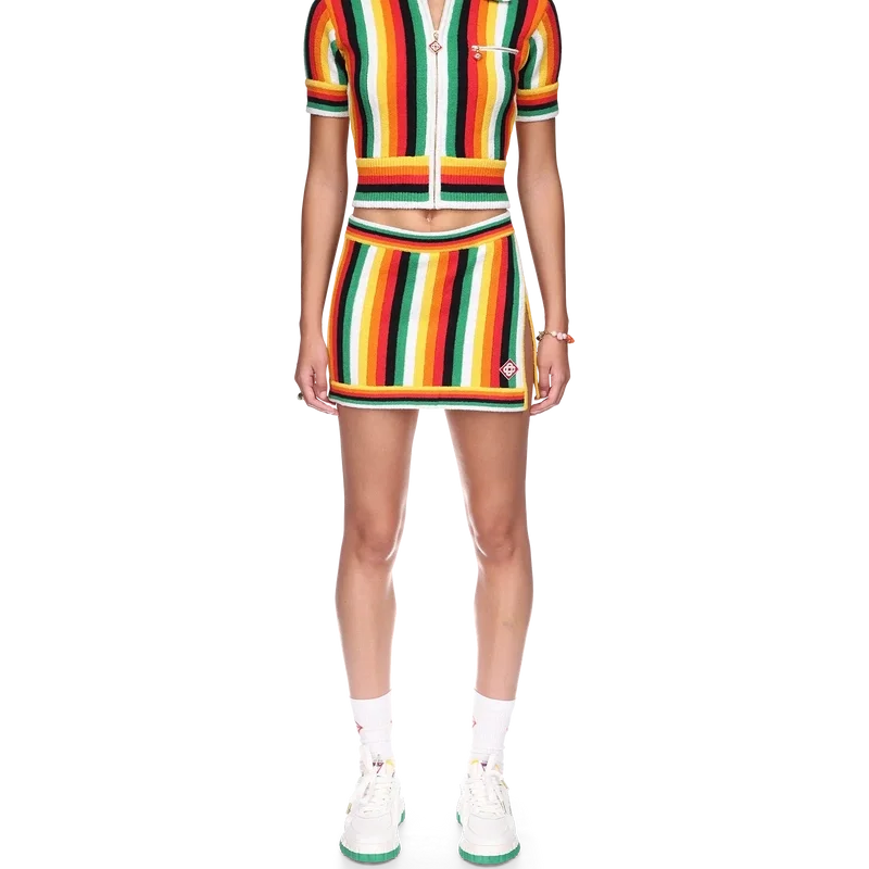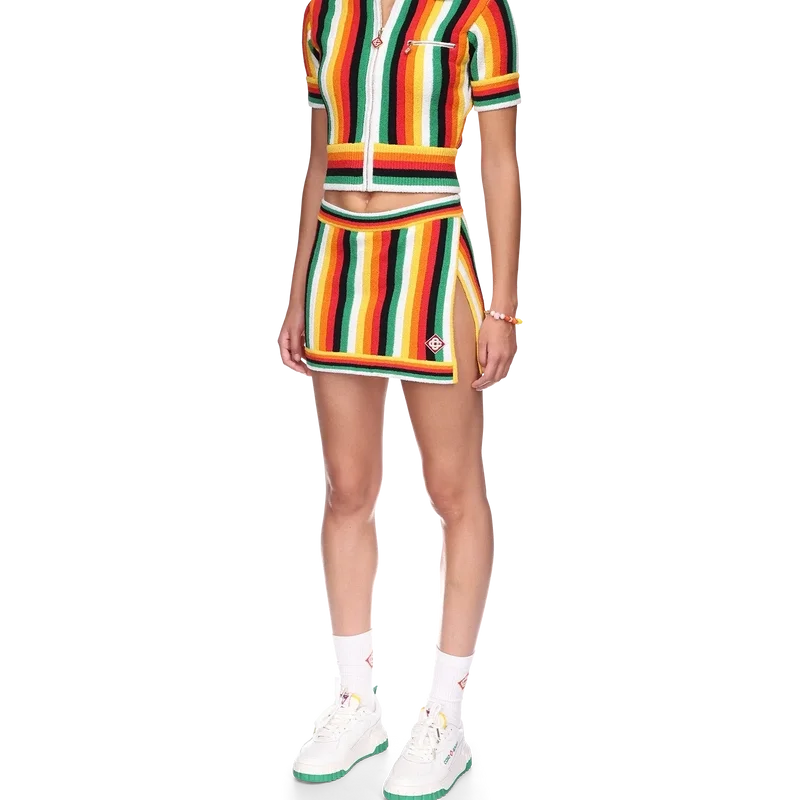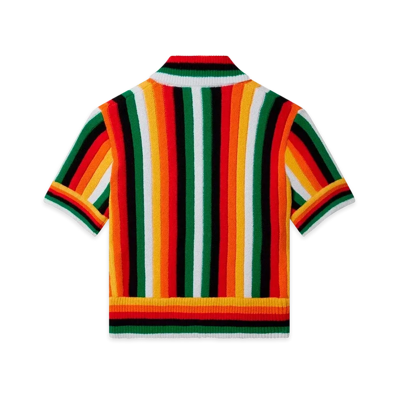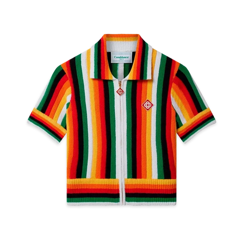 A camisola de tecido de felpo às riscas é um modelo de manga curta confeccionado num tecido de felpo 3D às riscas de mistura de algodão, com cores sazonais e o logótipo de diamante característico da marca. Apresenta fecho de correr, gola, bainha e punhos canelados.