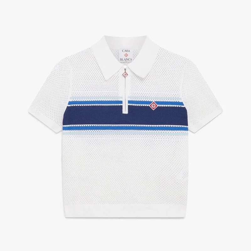Uma blusa de malha às riscas brancas e azuis apresenta um design de malha requintado com uma risca azul no peito e nas costas. Completa-se com um clássico colarinho canelado, punhos e bainha com detalhes, mangas curtas, o logótipo de diamante característico da marca e fecho de correr numa silhueta justa. Concebida para ser usada com a saia de malha a condizer.