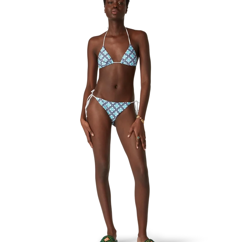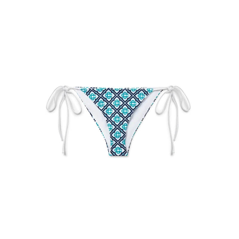 A parte de baixo do biquíni Monogram é um modelo estampado confecionado num tecido técnico respirável, apresentando um monograma em degradê que oferece uma variação da estampa emblemática da Casablanca. Completada com acabamentos brancos e fecho de cordão, esta peça apresenta o rebite CC entrelaçado emblemático da marca, destinada a ser usada com o top a condizer.