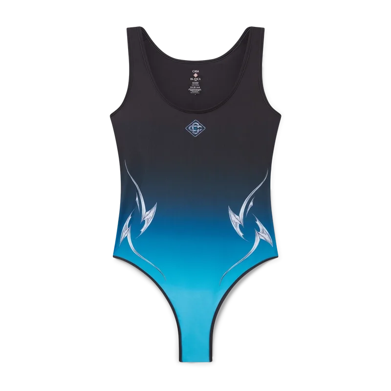 O Fato de Banho Blades apresenta um design estampado, confecionado num tecido técnico respirável para natação, com um desenho que joga com o contraste entre dois sentimentos opostos — a nitidez da lâmina e o frio do cromo prateado, contrastando com o calor da natureza, como os tons ousados de rosa e vermelho de uma flor de orquídea. A adição da água confere um elemento fresco e revigorante ao design. Completado com pernas de corte alto, decote redondo, costas recortadas e o logótipo de diamante característico da marca no peito.