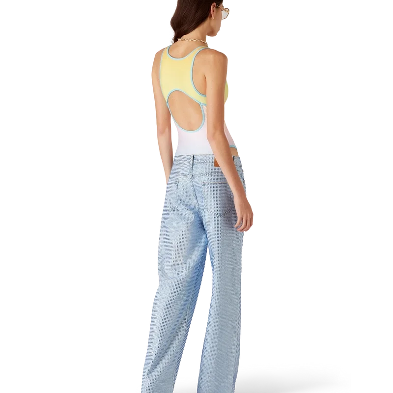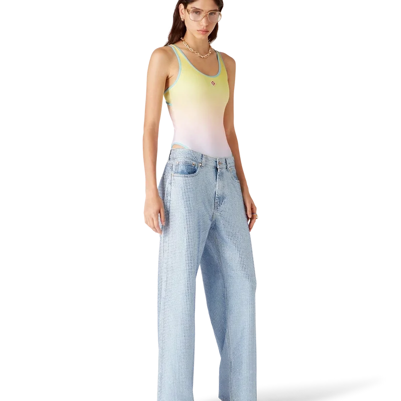 O fato de banho Gradient é um modelo estampado confecionado em tecido técnico respirável para banho, apresentando uma paleta sóbria de azul, turquesa, rosa e amarelo, num gradiente de cores. Completado com acabamentos contrastantes, pernas de corte alto, decote redondo, recorte nas costas e o logótipo de diamante característico da marca no peito.