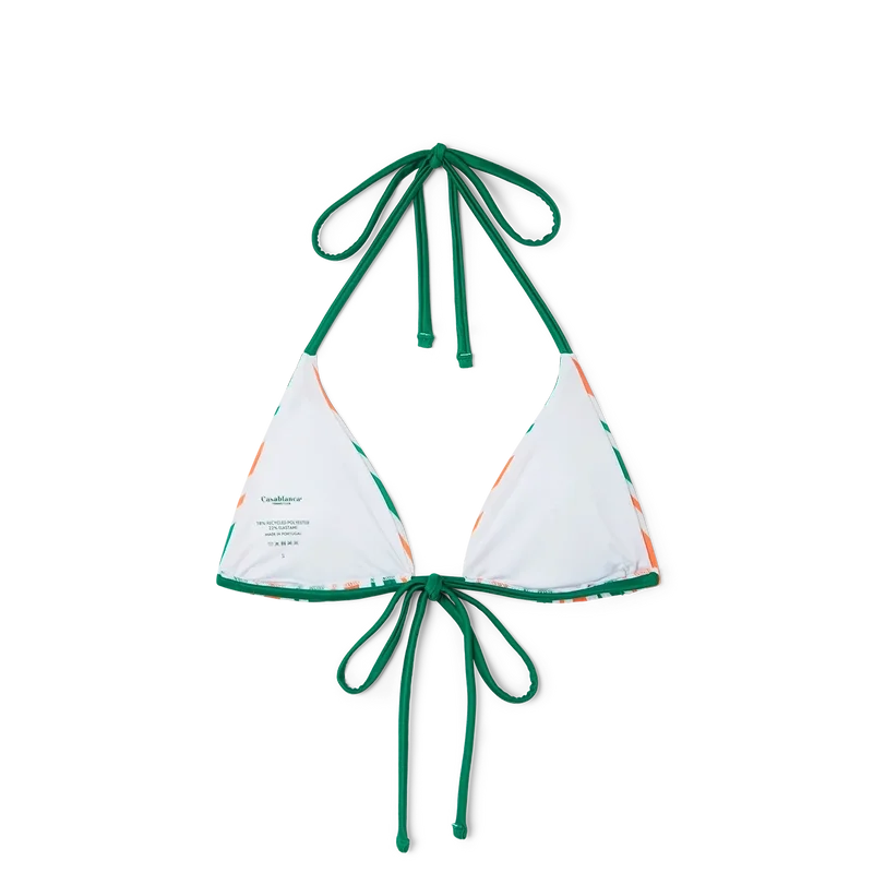 O top de biquíni com cordões às riscas é um modelo triangular com cores da estação e cordões verdes de fecho no pescoço e nas costas. Esta peça é complementada com almofadas removíveis e destina-se a ser usada com as cuecas a condizer.