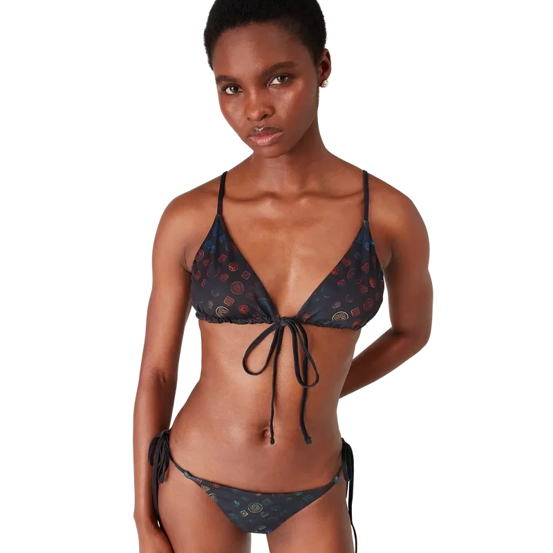 O top de biquíni com alças Monogram apresenta um design triangular clássico com o icónico padrão Monogram multicolorido da marca. Completo com copas removíveis e alças com fecho no pescoço e nas costas. Concebido para ser usado com a parte de baixo de biquíni Monogram a condizer.