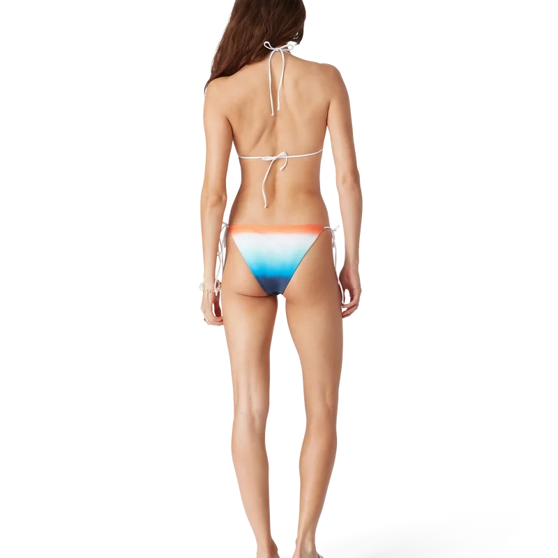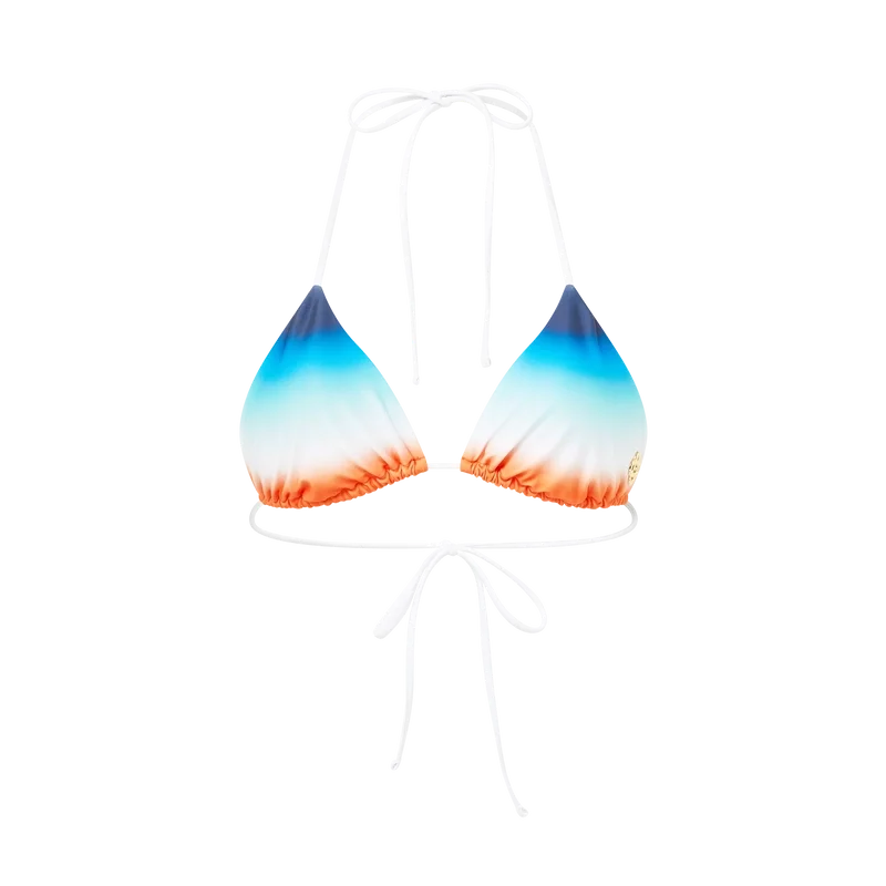 O top de biquíni Gradient é um modelo triangular estampado, confecionado num tecido técnico respirável, apresentando uma paleta sóbria de azul, turquesa, branco e laranja num gradiente de cores criado especialmente para a coleção, confecionado num tecido técnico. Rematado com acabamentos brancos e fecho de cordões no pescoço e nas costas, esta peça apresenta o rebite Cc entrelaçado, marca de assinatura da marca, na copa esquerda. Esta peça inclui almofadas removíveis e destina-se a ser usada com as cuecas a condizer.
