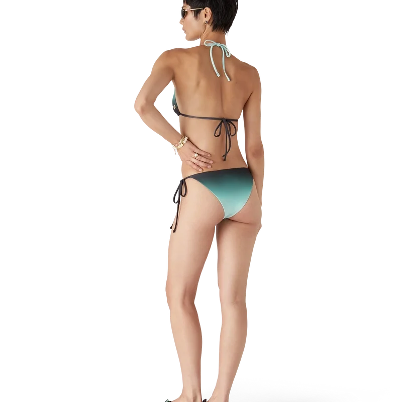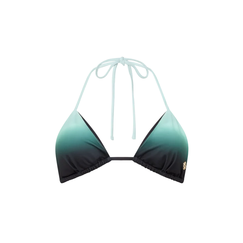O top de biquíni Gradient apresenta um padrão estampado confecionado num tecido técnico respirável para banho, com um degradé em menta inspirado na paleta de cores do Park Hyatt, um icónico hotel de Tóquio que utiliza menta e preto no seu design de interiores. Com fechos de cordão no pescoço e nas costas – esta peça foi concebida para ser usada com a parte de baixo de biquíni a condizer.