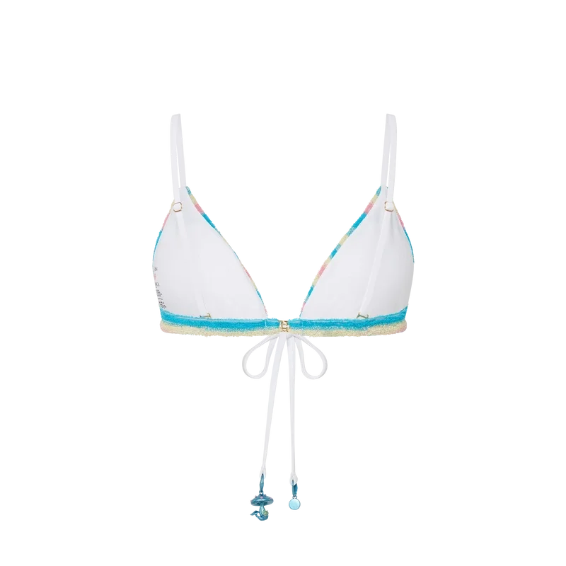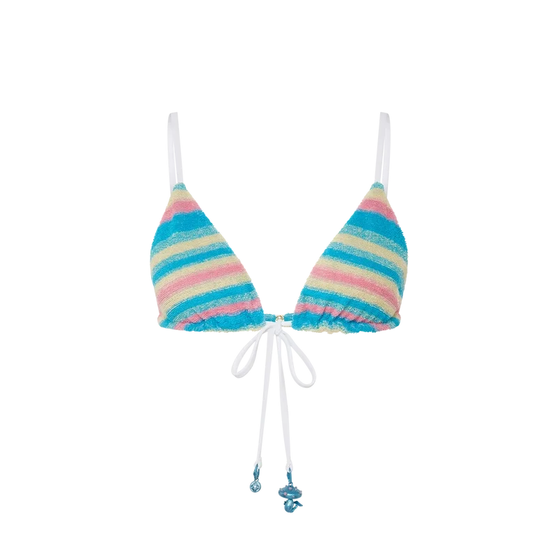 O top de biquíni em tecido de felpo às riscas é confecionado em tecido de felpo e apresenta o rebite CC entrelaçado banhado a ouro da marca. Completo com um fecho de cordão contrastante no pescoço e nas costas, rematado com os pingentes sazonais em forma de cogumelo e com o logótipo CC da marca.
