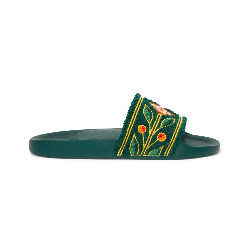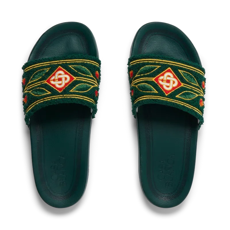 Os chinelos Laurel Terry são confecionados em tecido felpudo bordado e apresentam o logótipo Diamond da marca e a icónica ilustração Laurel na parte superior. Completam-se com solas almofadadas, macias e flexíveis, semelhantes a borracha.