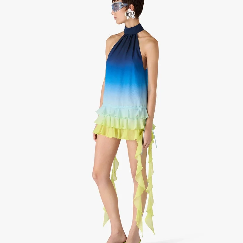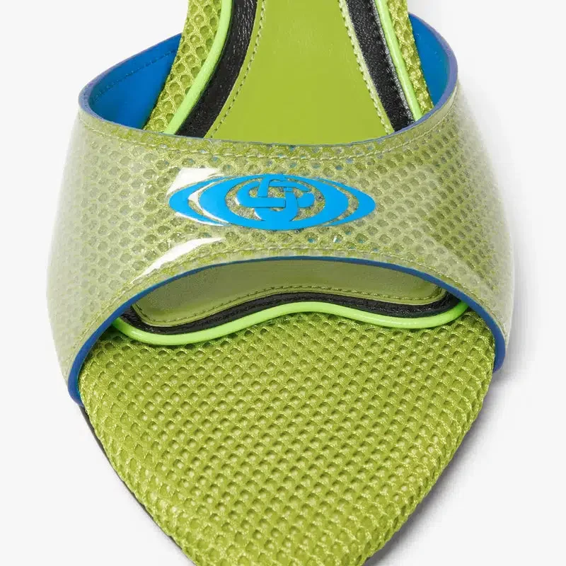 As sandálias mules de salto verde apresentam um design requintado, sem costas e sem tiras, com uma elegante silhueta de biqueira aberta. Completadas com o logótipo distorcido da marca na parte superior e um salto baixo elegante que personifica a abordagem sofisticada da marca ao calçado de verão.