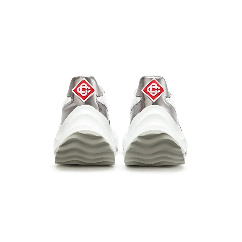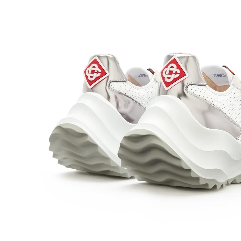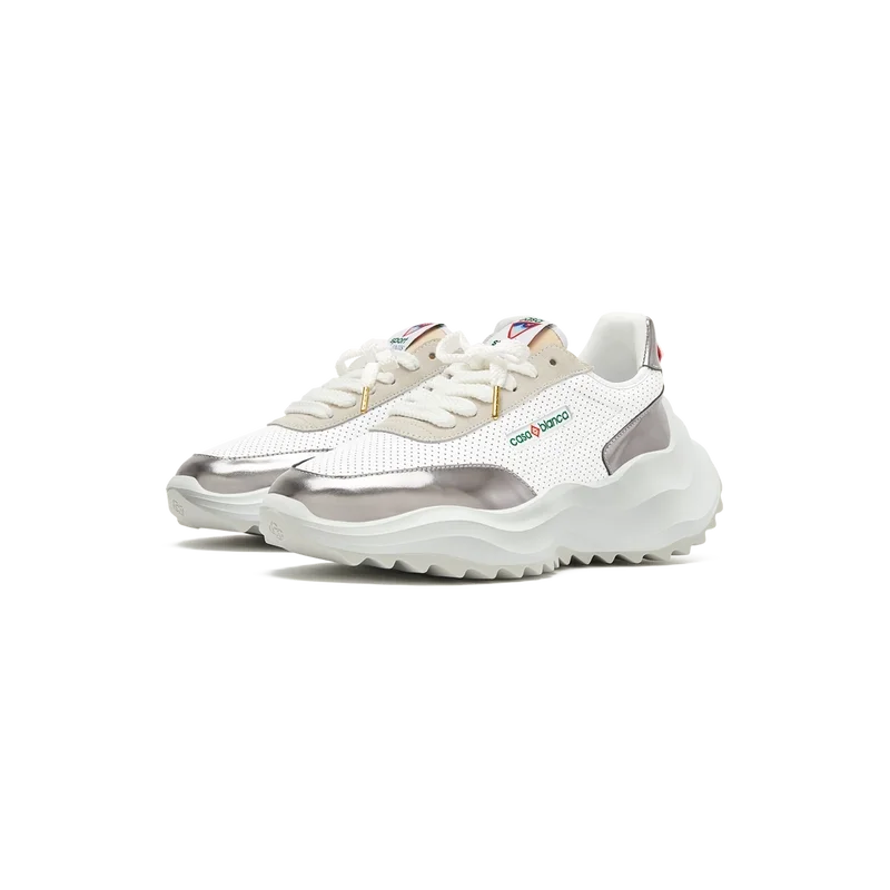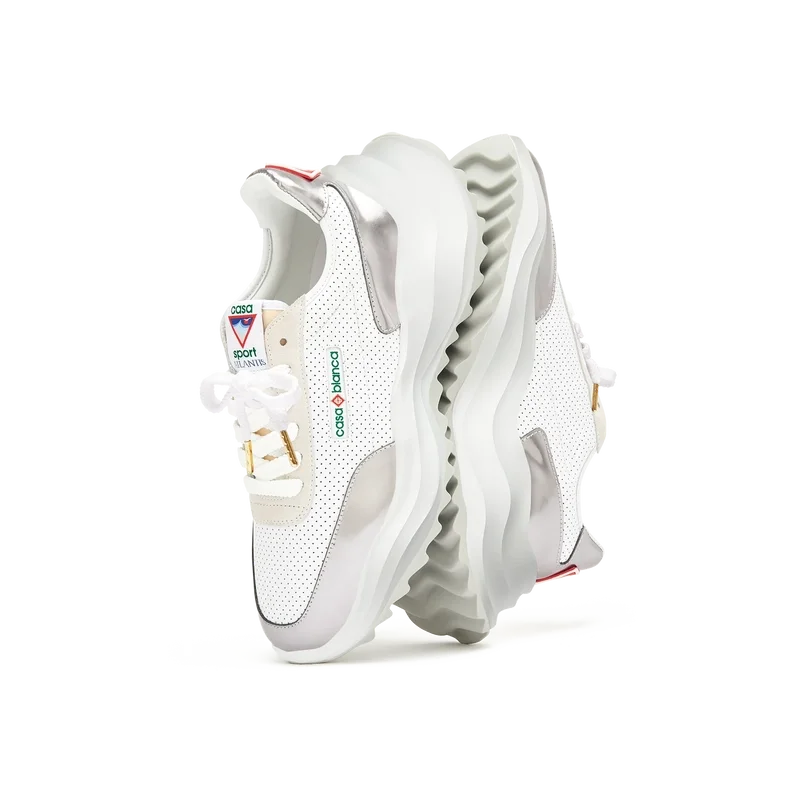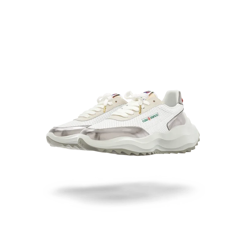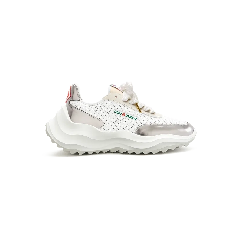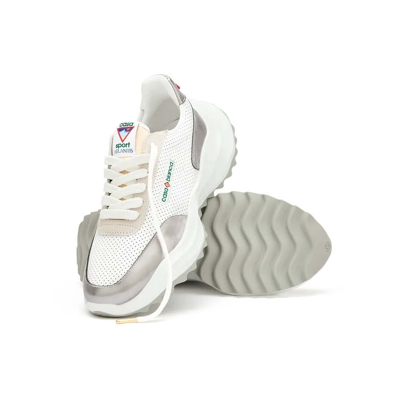 Sobreposições em couro envernizado cromado tonal, parte superior em couro perfurado, atacadores em camurça contrastante, patch de borracha com o diamante da Casablanca na aba do calcanhar, aba lateral com a marca Casa Sport tecida, etiqueta Atlantis tecida na língua, entressola em EVA esculpida com efeito ondulado, sola exterior em borracha, pontas dos atacadores douradas