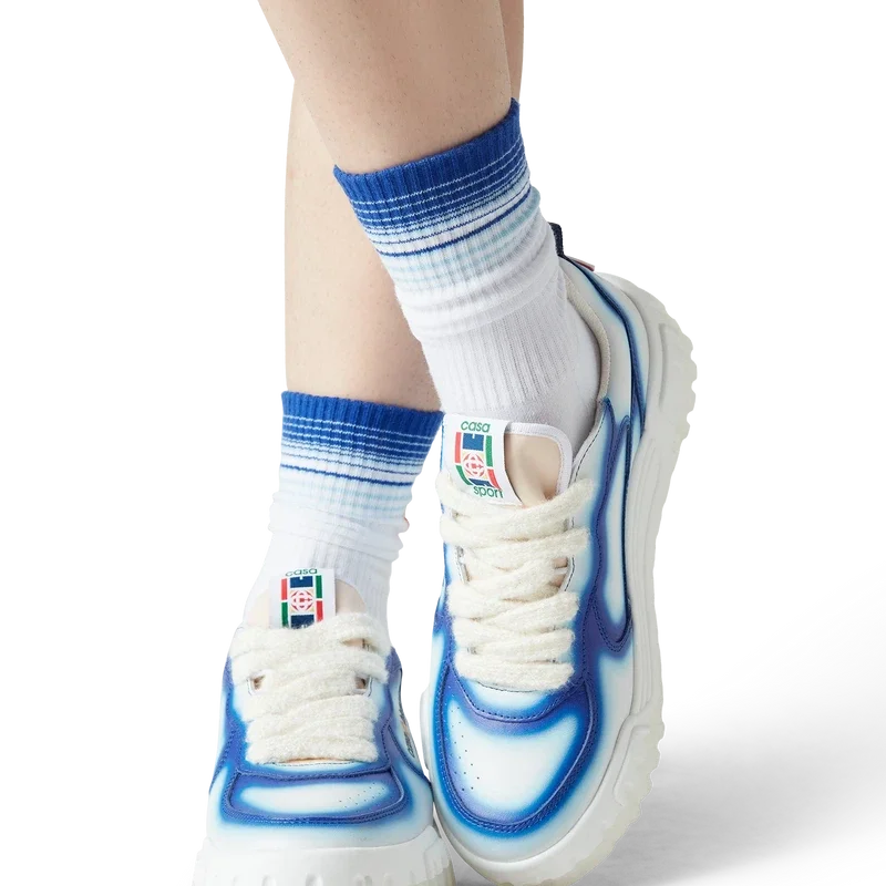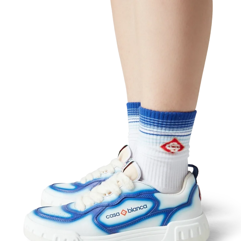 A linguagem de design do ténis Court reflete as silhuetas icónicas dos anos 90. As cores presentes na sola de borracha são uma combinação dos códigos refinados do ténis e da arquitetura clássica e criam uma paleta unificada em todo o calçado, com foco nas cores primárias contrastadas pelo branco do ténis para criar uma narrativa de cores com foco no desporto. A parte superior dos sapatos apresenta linhas de painéis integradas e fluidas, numa referência às silhuetas icónicas dos anos 90. A marca Casablanca está bem visível em todo o sapato, incluindo o motivo de diamante característico da marca no calcanhar, os painéis laterais com a marca em silicone e a etiqueta da língua e a palmilha com o motivo de campo de ténis tecido, dando origem ao seu nome, o Court.