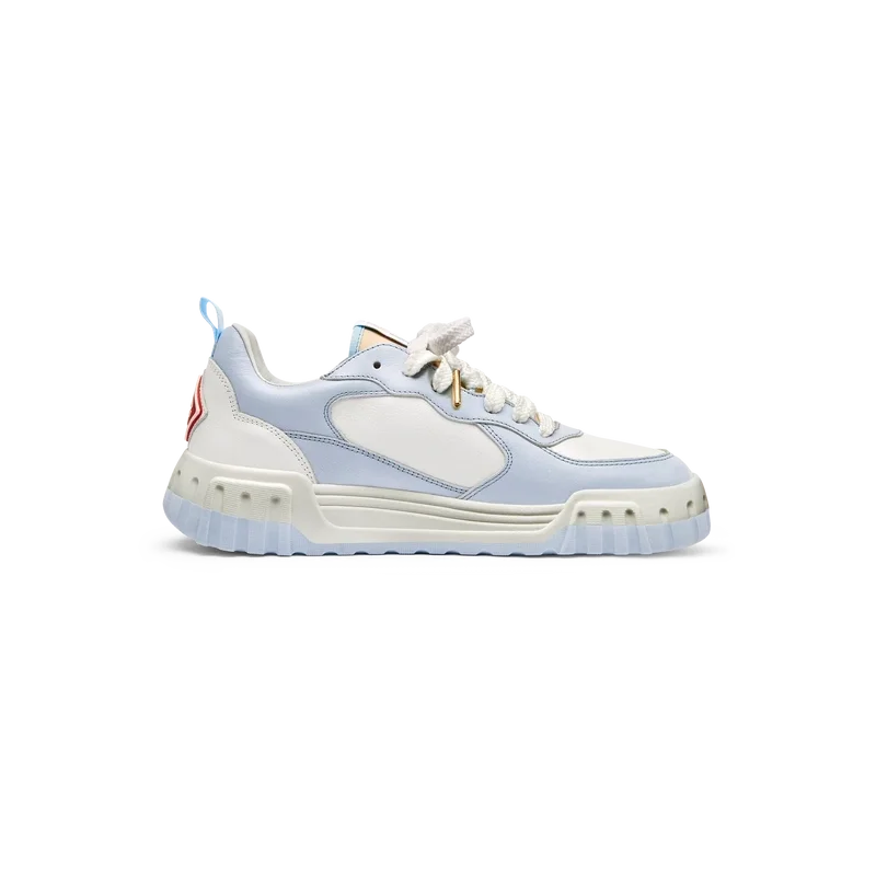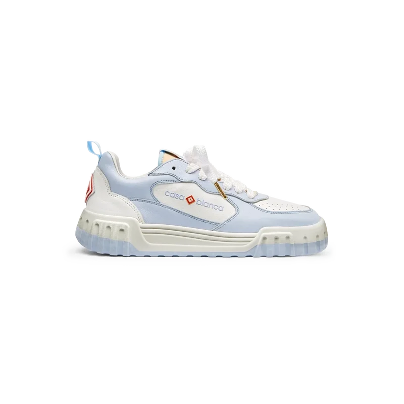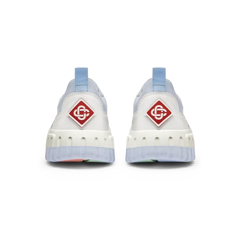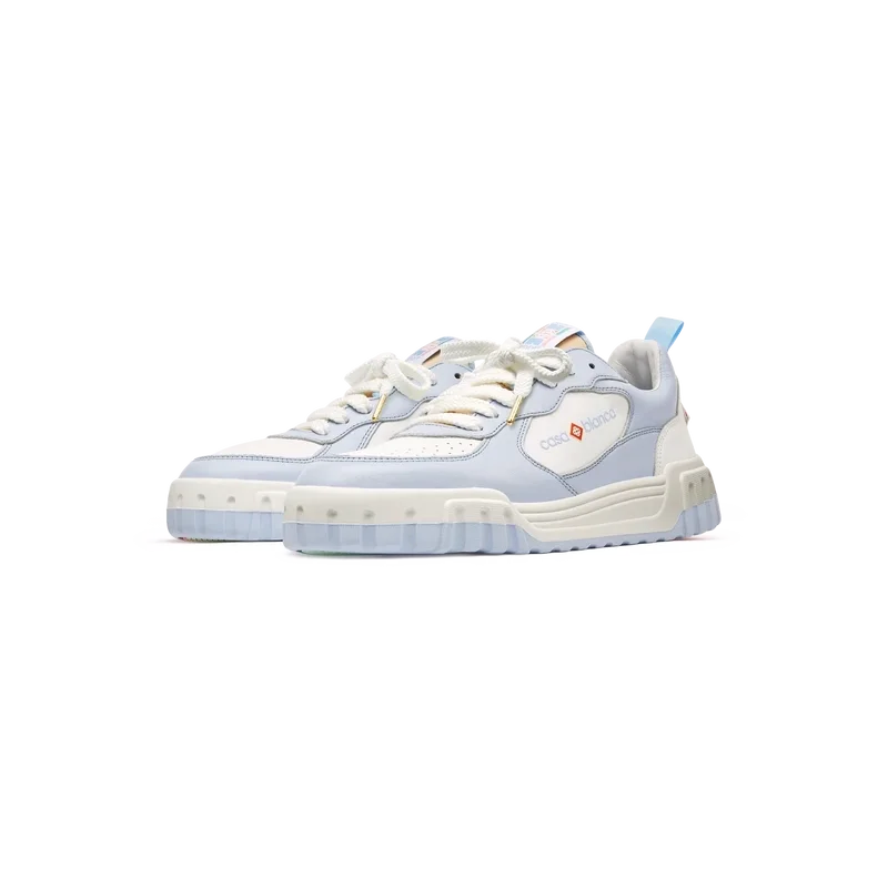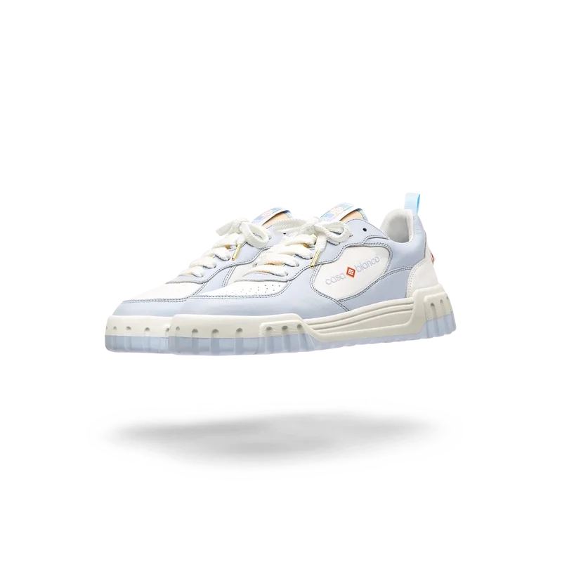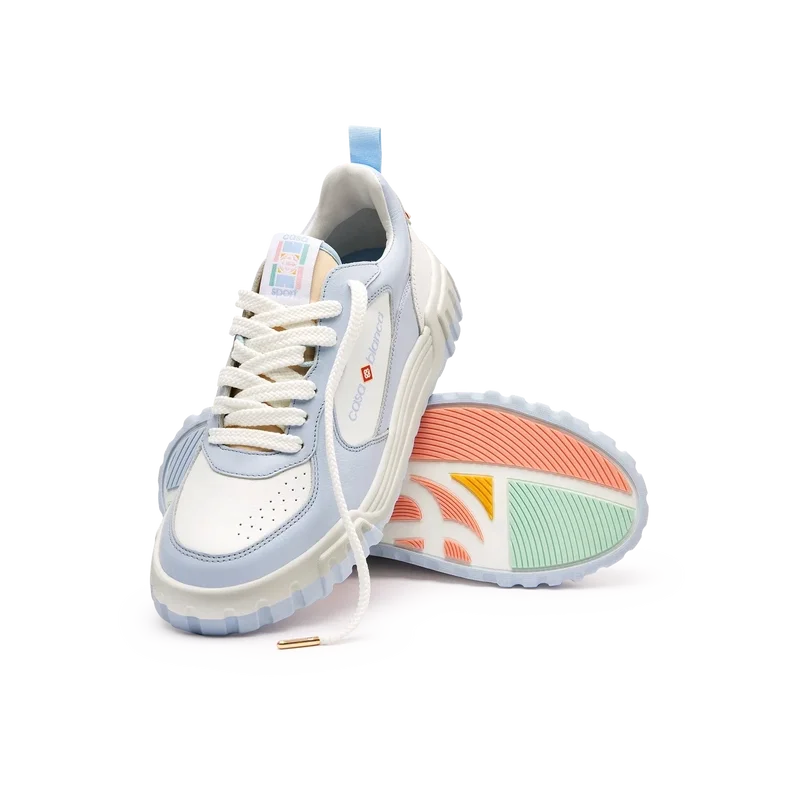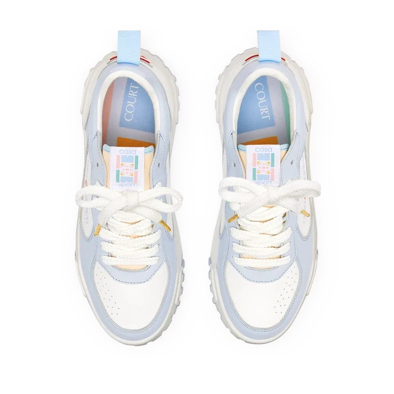A parte superior dos sapatos apresenta linhas de painéis integradas e fluidas, numa referência às silhuetas icónicas dos anos 90. A marca Casablanca está bem visível em todo o sapato, incluindo o motivo de diamante característico da marca no calcanhar, o logótipo em silicone nos painéis laterais e a etiqueta da língua e a palmilha com o motivo tecido de um campo de ténis, dando origem ao seu nome, o Court.