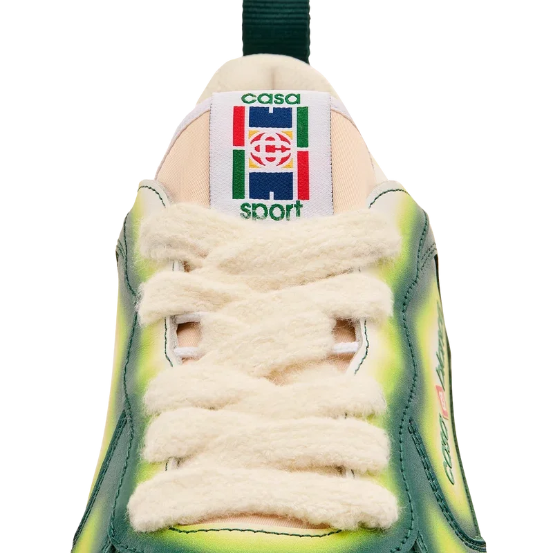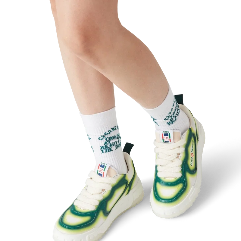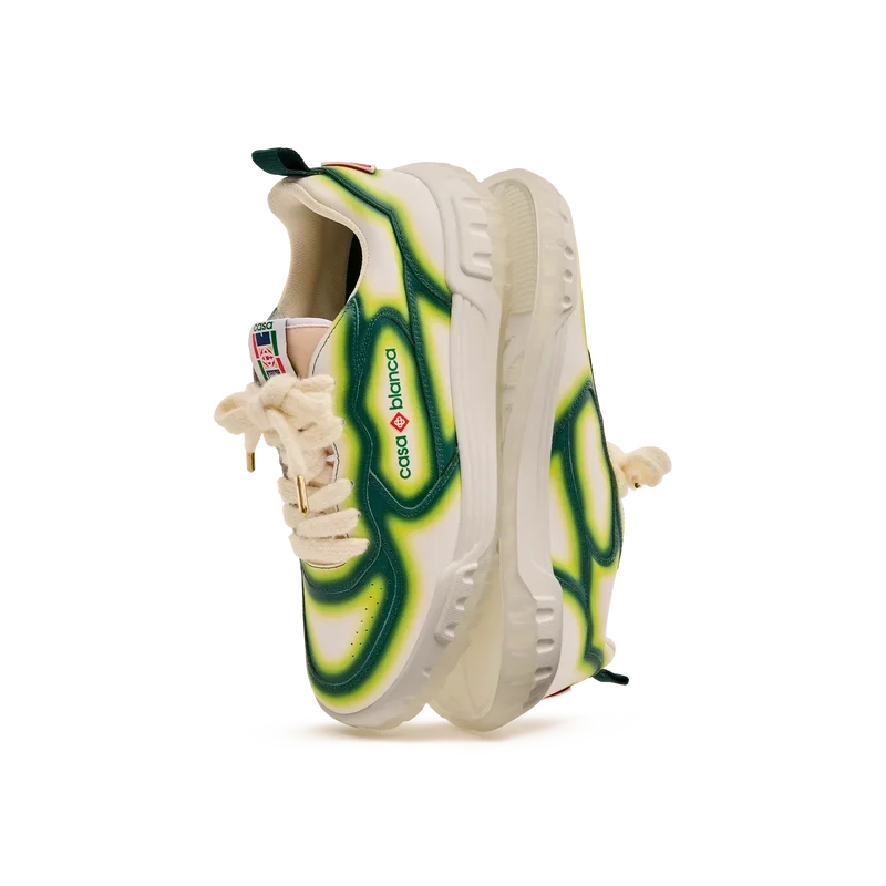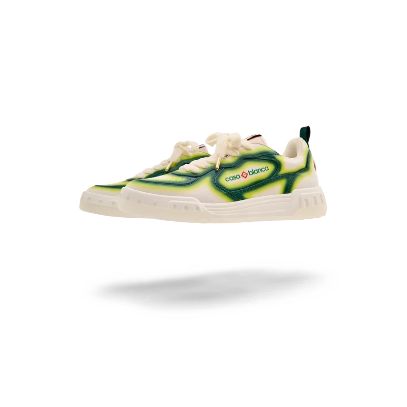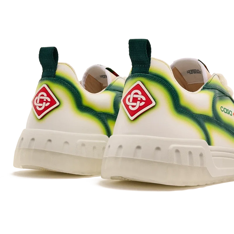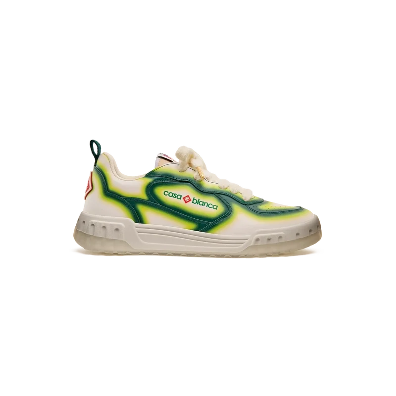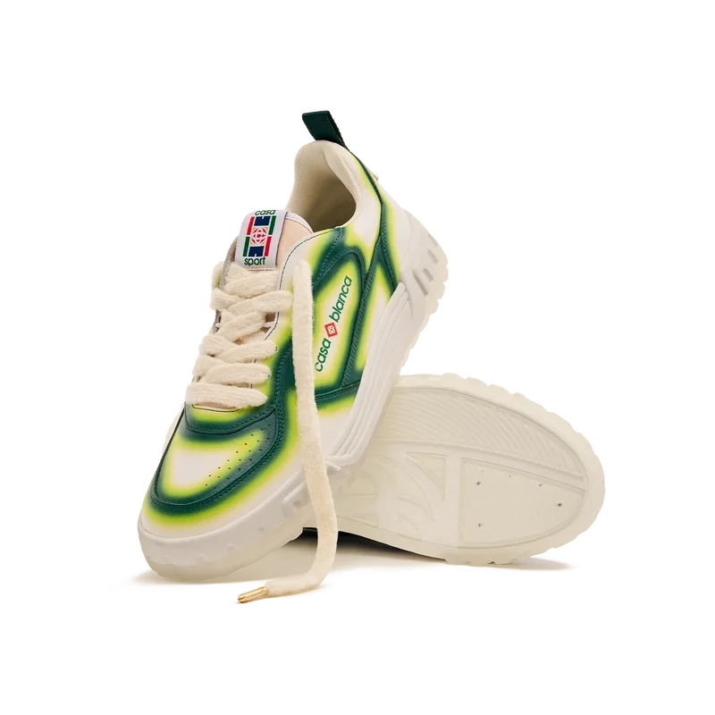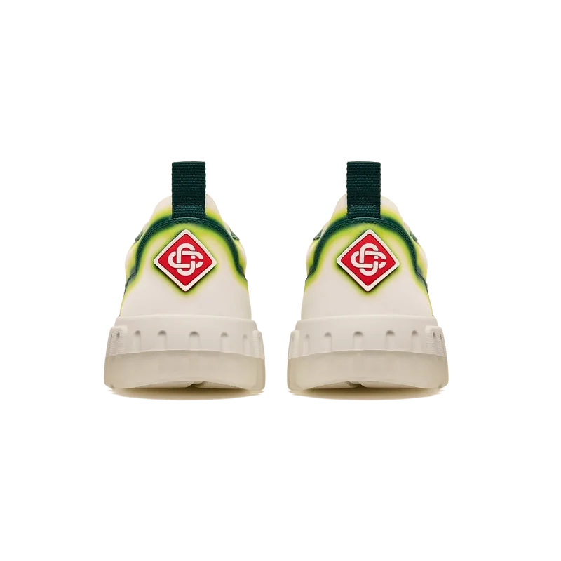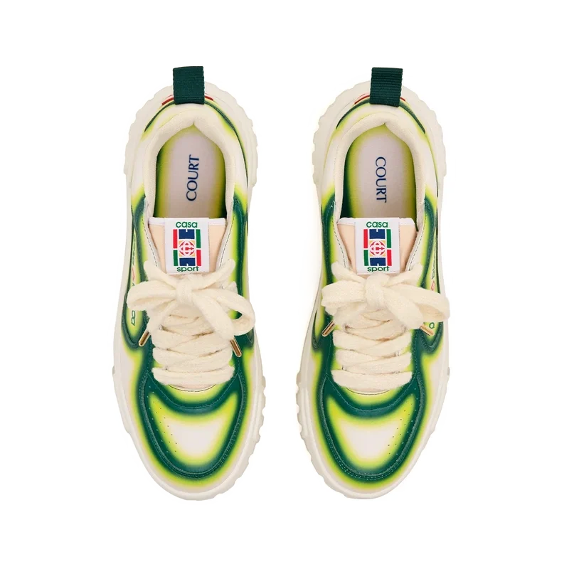 A linguagem de design do ténis Court reflete as silhuetas icónicas dos anos 90. As cores presentes na sola de borracha são uma combinação dos códigos refinados do ténis e da arquitetura clássica, criando uma paleta unificada em todo o calçado, com destaque para as cores primárias contrastadas pelo branco do ténis, para criar uma narrativa de cores com foco no desporto. A parte superior dos sapatos apresenta linhas de painéis integradas e fluidas, numa referência às silhuetas icónicas dos anos 90. A marca Casablanca está bem visível em todo o sapato, incluindo o motivo de diamante característico da marca no calcanhar, o logótipo em silicone nos painéis laterais e a etiqueta da língua e a palmilha com o motivo de um campo de ténis tecido, dando origem ao seu nome, o Court.