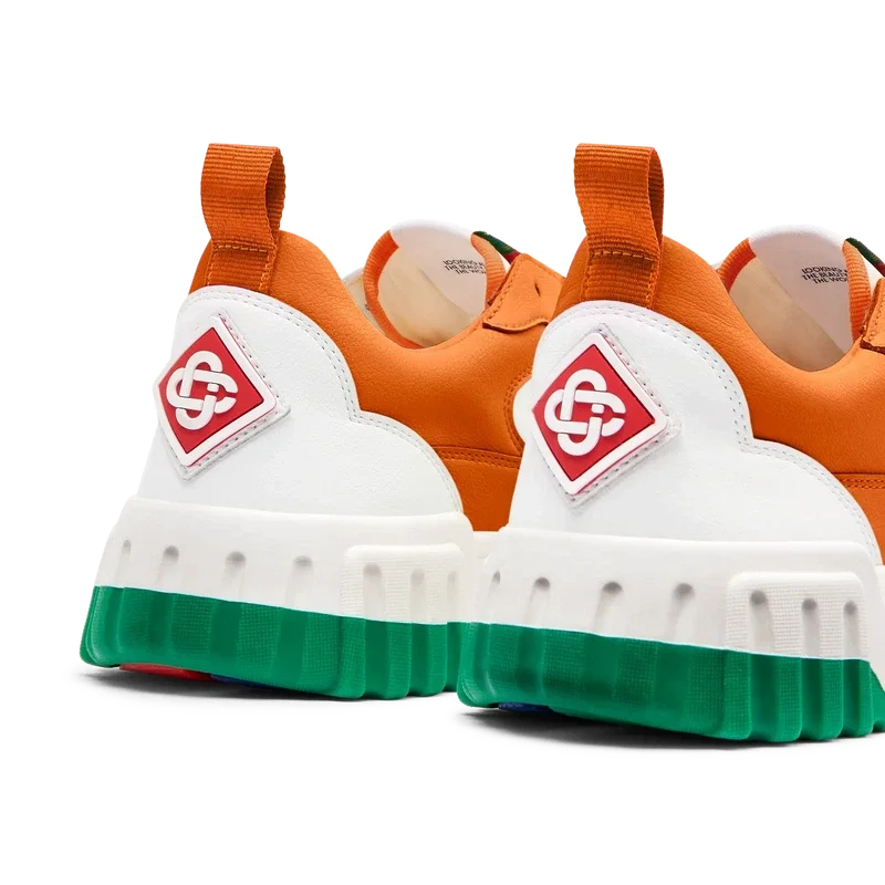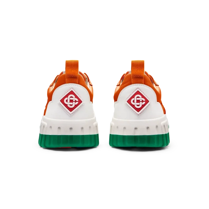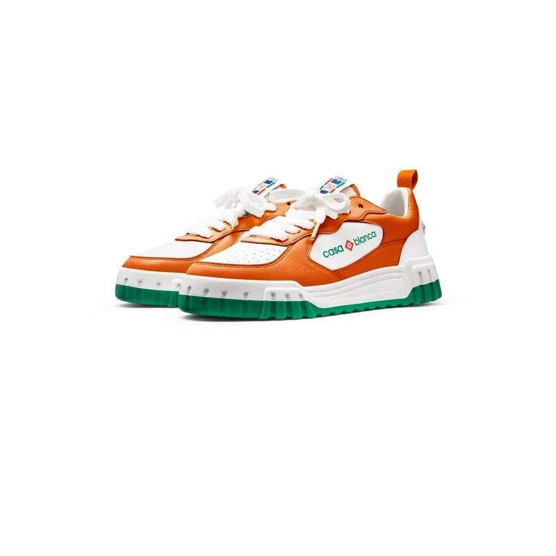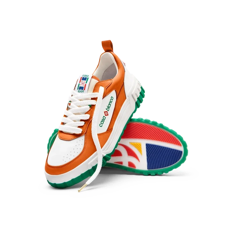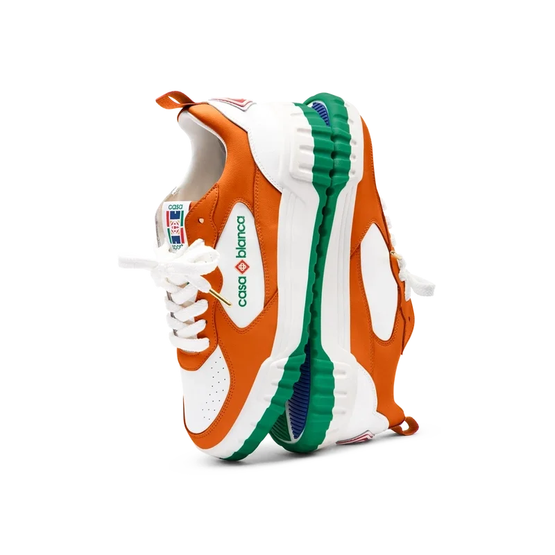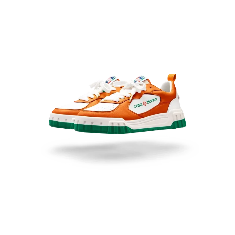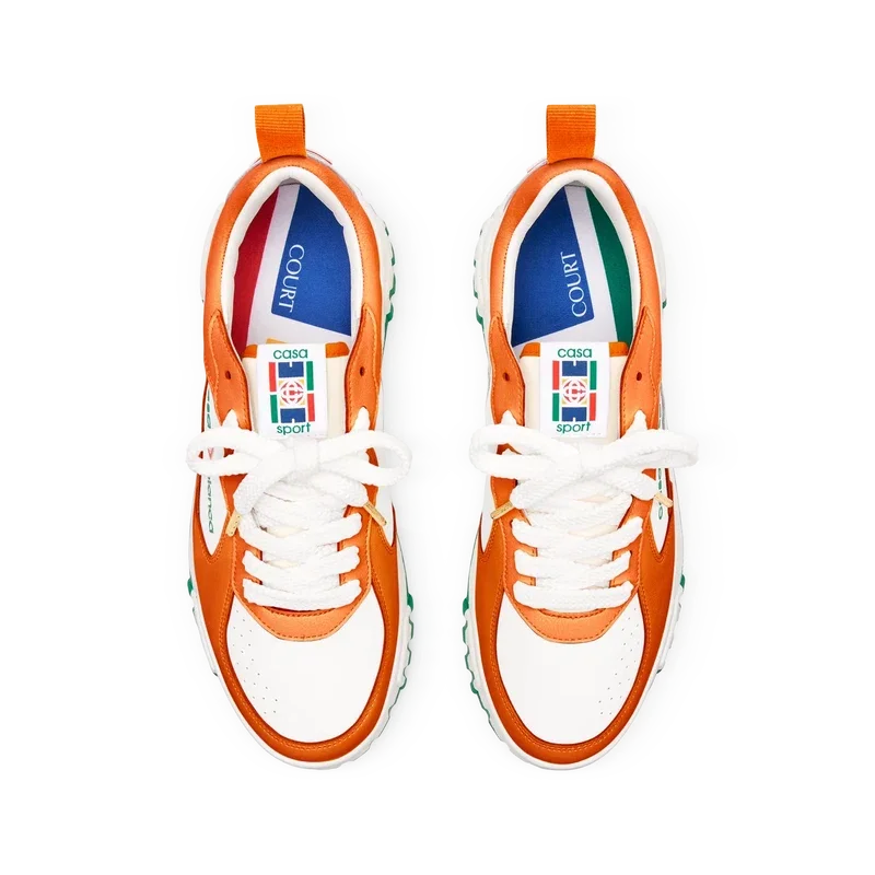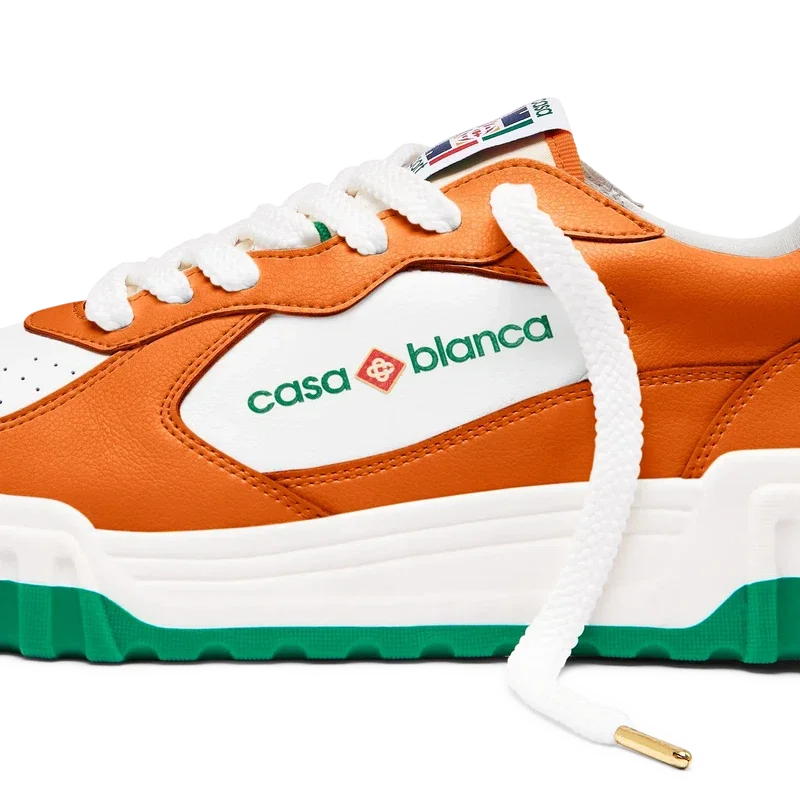 A marca Casablanca está bem visível em todo o sapato, incluindo o motivo de diamante característico da marca no calcanhar, o logótipo em silicone nos painéis laterais e a etiqueta na língua e a palmilha com o motivo tecido de um campo de ténis, dando origem ao seu nome, o Court.