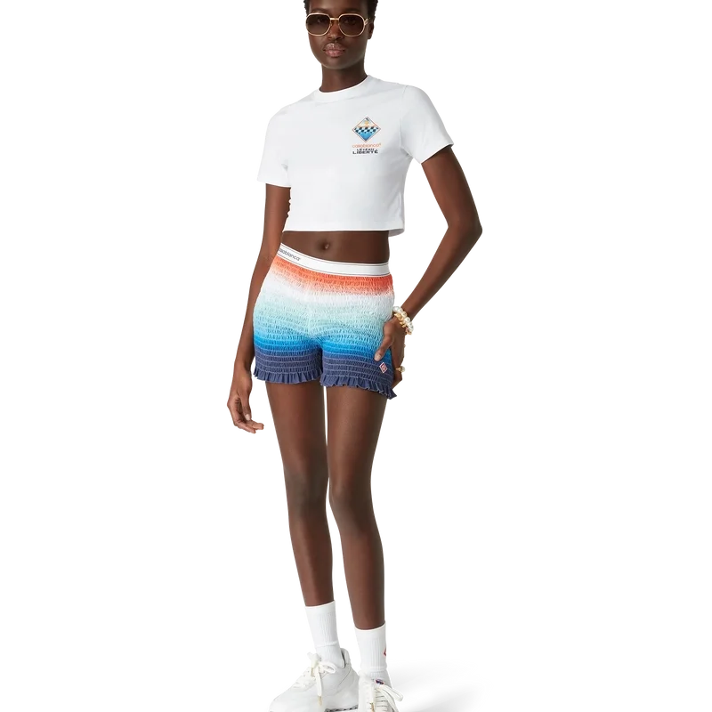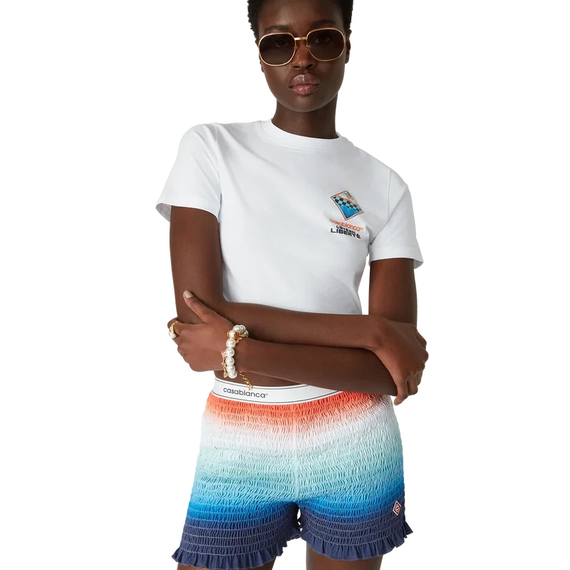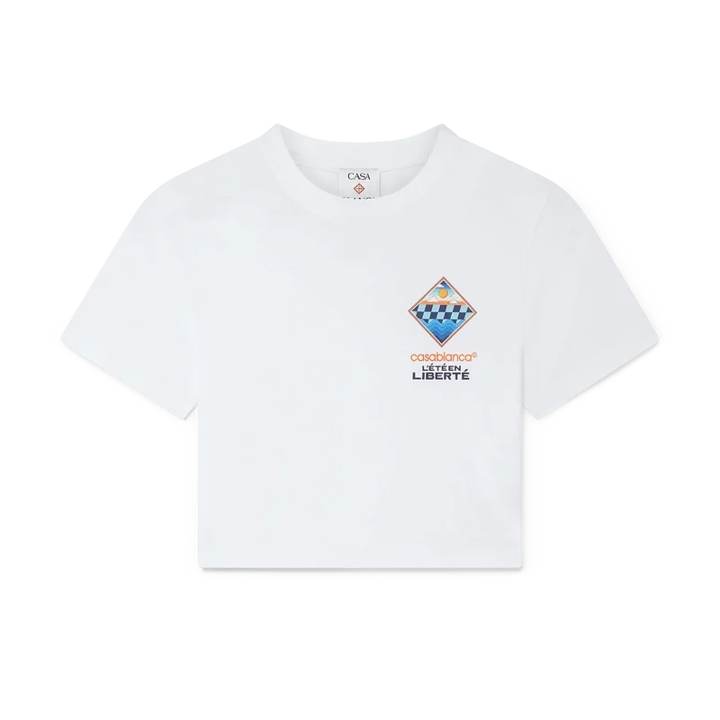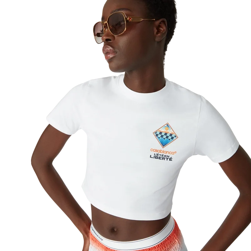 A T-shirt curta L’ÉTa En Liberta é um modelo estampado de manga curta, confeccionado em tecido de algodão orgânico, apresentando a arte sazonal da marca com elementos de design inspirados na natureza, na arquitetura e no ténis. Apresenta um clássico decote redondo. Concebida para ficar acima do umbigo.