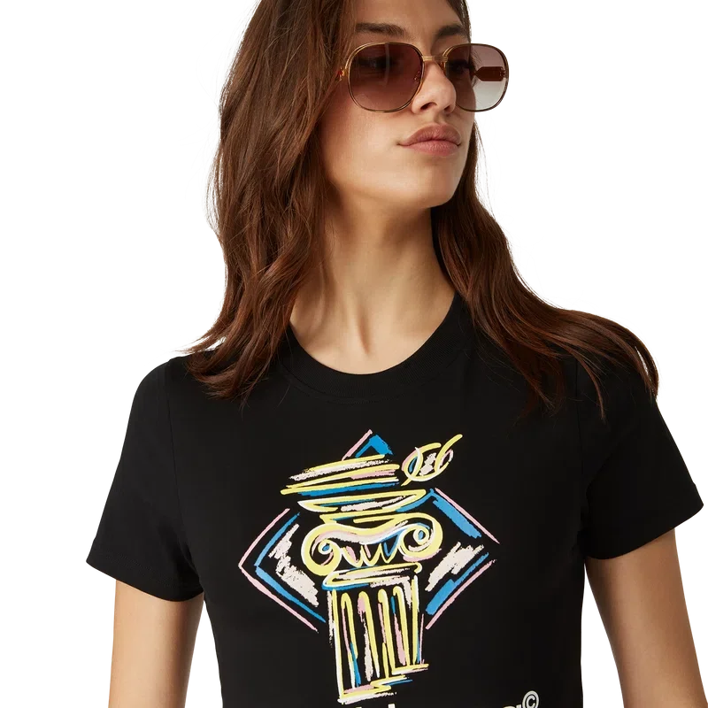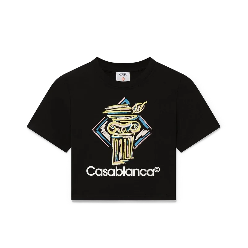 A T-shirt Diamond Column Baby é um modelo curto de calções de manga curta com estampado, confeccionado em tecido de mistura de algodão, apresentando a iconografia da coluna a lápis de cera da marca. Com um clássico decote redondo – concebida para ficar acima do umbigo.