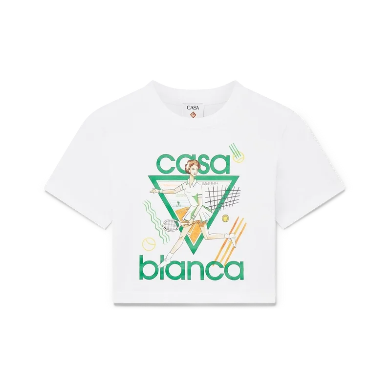 Uma T-shirt para bebé Tennis Girl é um modelo de manga curta com estampado, confeccionado em tecido de mistura de algodão, apresentando a arte sazonal da marca inspirada no estudo contínuo da beleza clássica e do encanto contemporâneo da Grécia Antiga. Com um clássico decote redondo – concebida para ficar acima do umbigo.