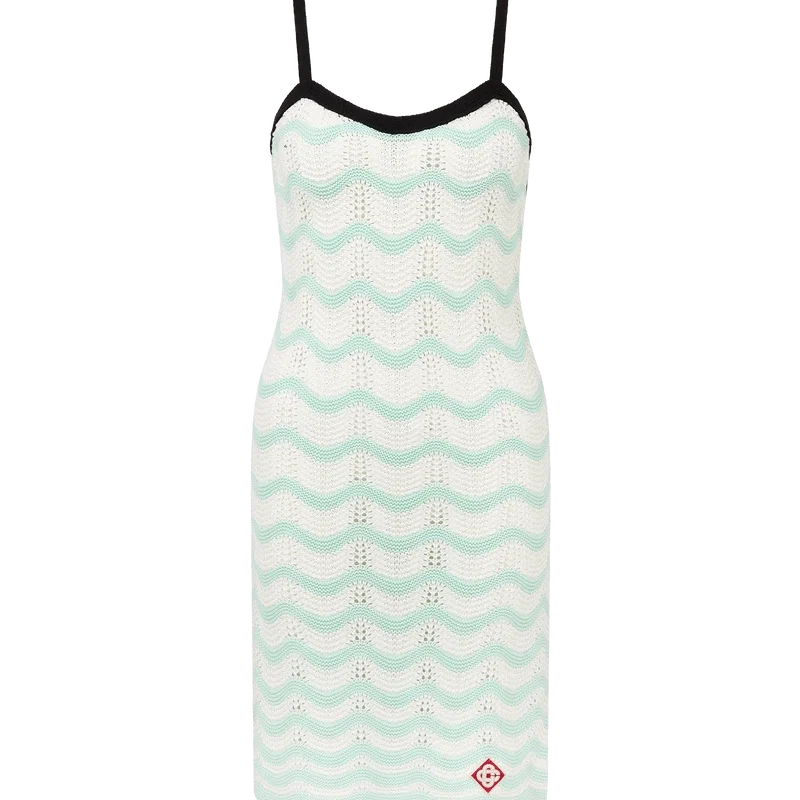 O mini-vestido em croché Wave é um modelo sem mangas que apresenta o logótipo em diamante característico da marca, confecionado em tecido de algodão em croché. Apresenta um decote nas costas, uma bainha inspirada na onda de Memphis, acabamentos em preto contrastante e alças finas que se prendem nas costas.