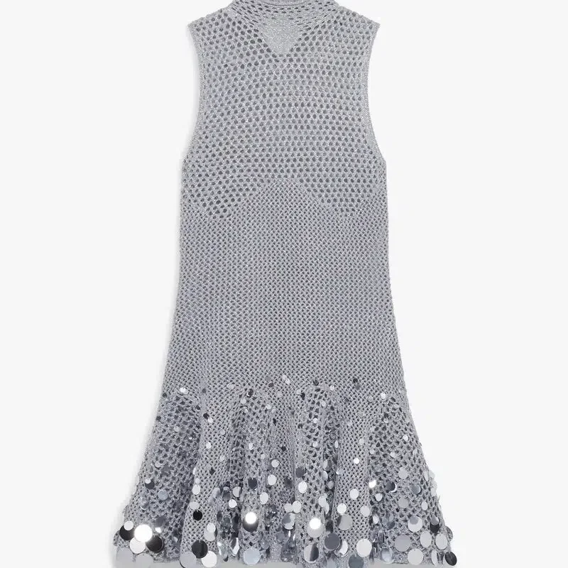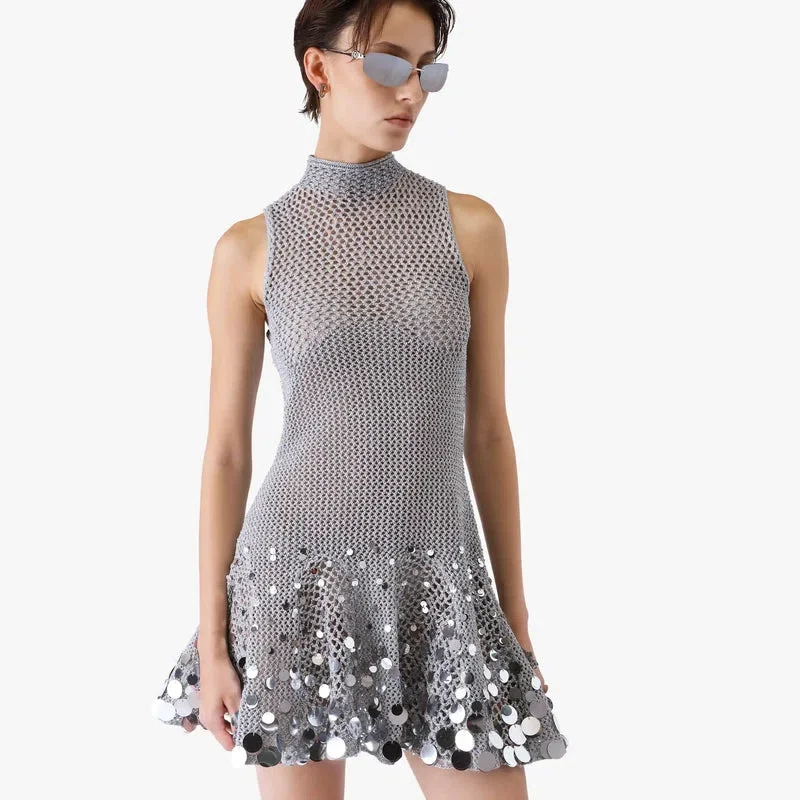 O mini-vestido de croché prateado com efeito espelhado apresenta um design requintado em malha com corte em A, caracterizado por uma delicada construção em croché prateado com efeito espelhado. Apresenta um decote alto, um corpete justo e uma silhueta sem mangas.